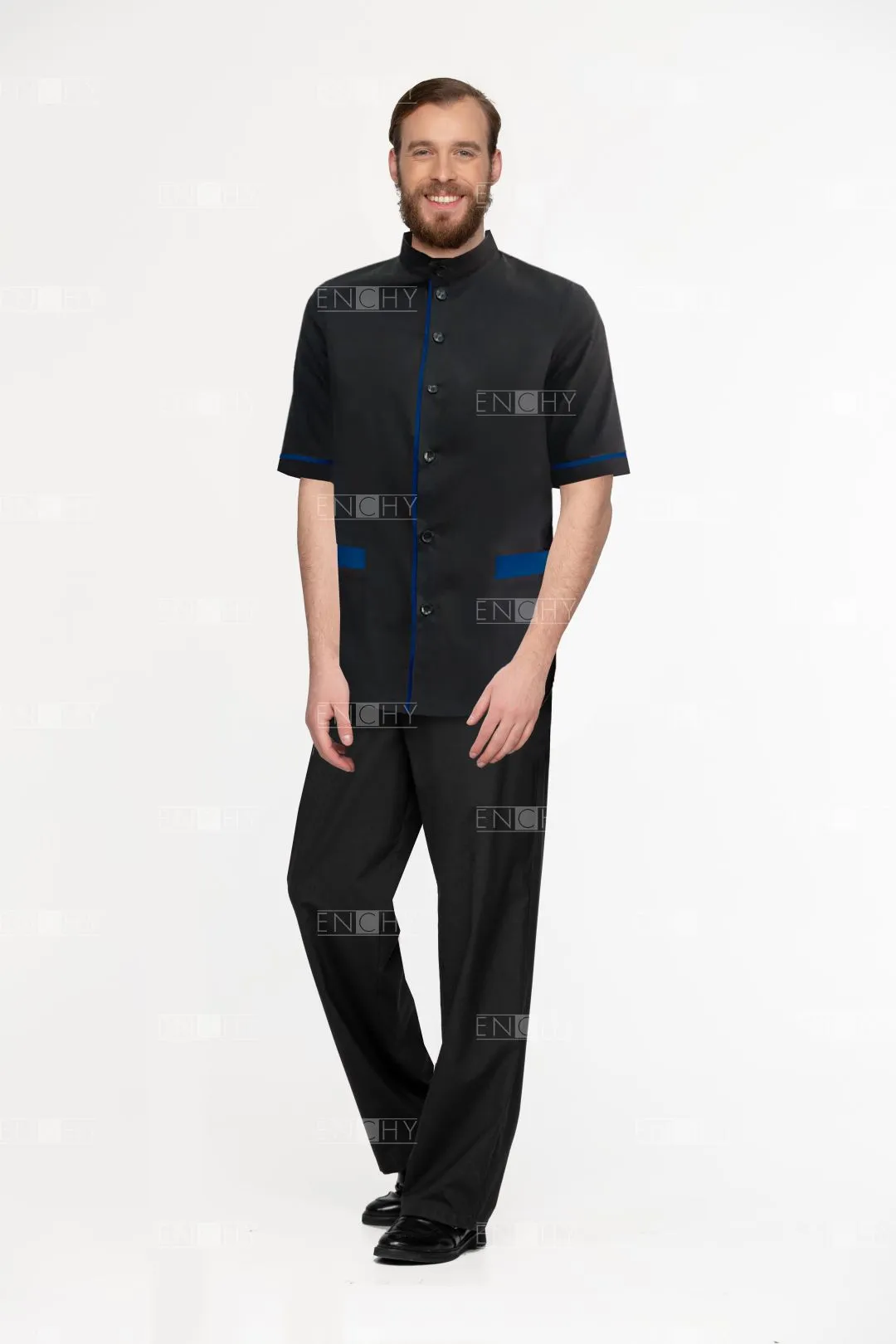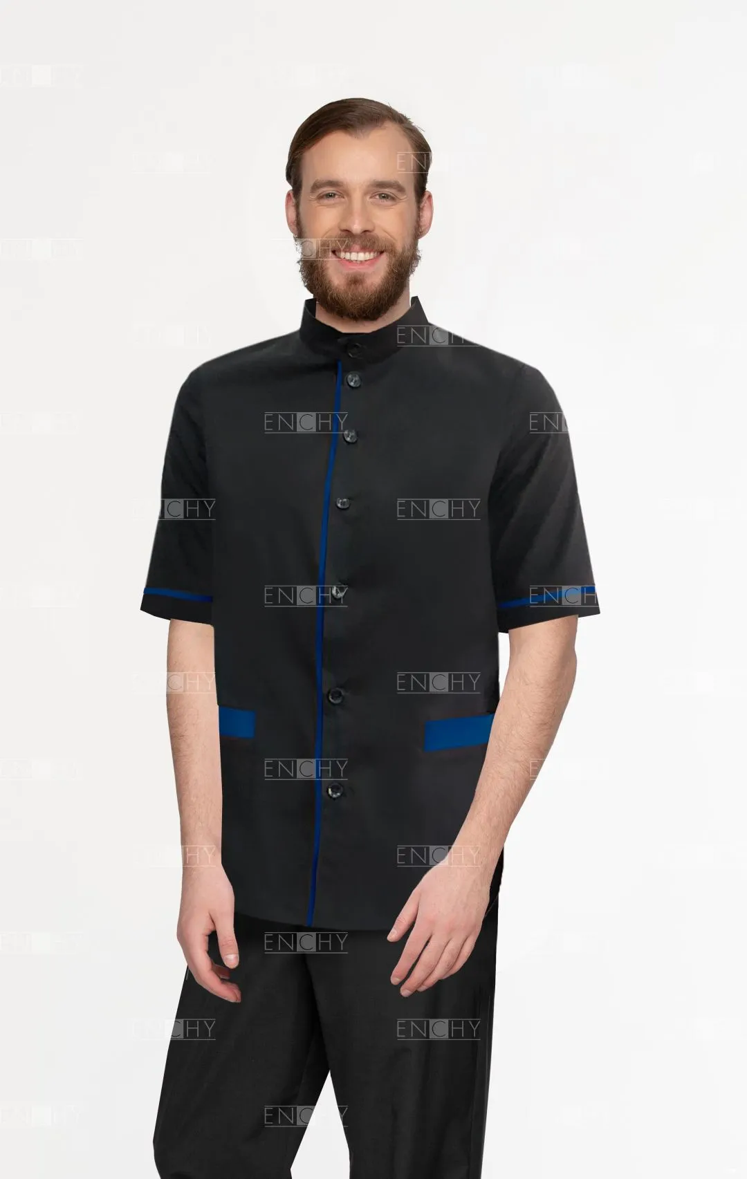 Мужская рабочая туника прямого силуэта. Воротник стойка, короткий рука, застежка на петли и пуговицы. В данной тунике можно поиграть с отделочной тканью и сделать канты контрастного цвета. У данной модели есть женский аналог- туника арт.7307.