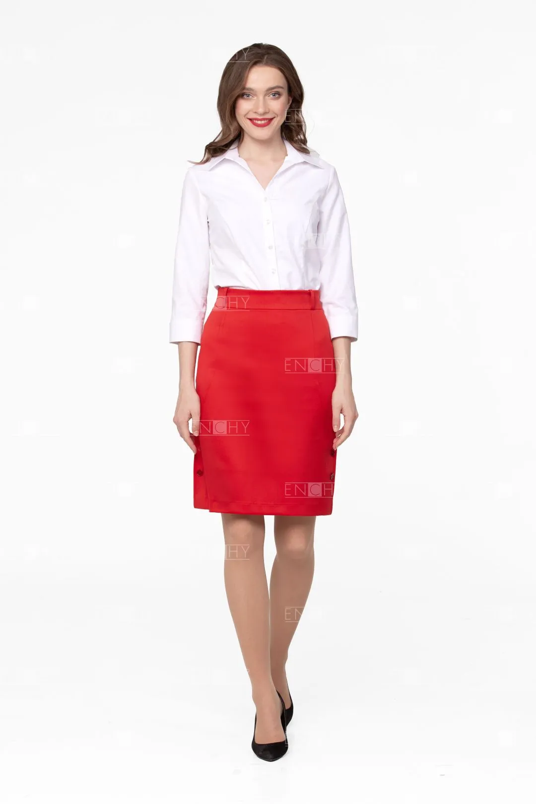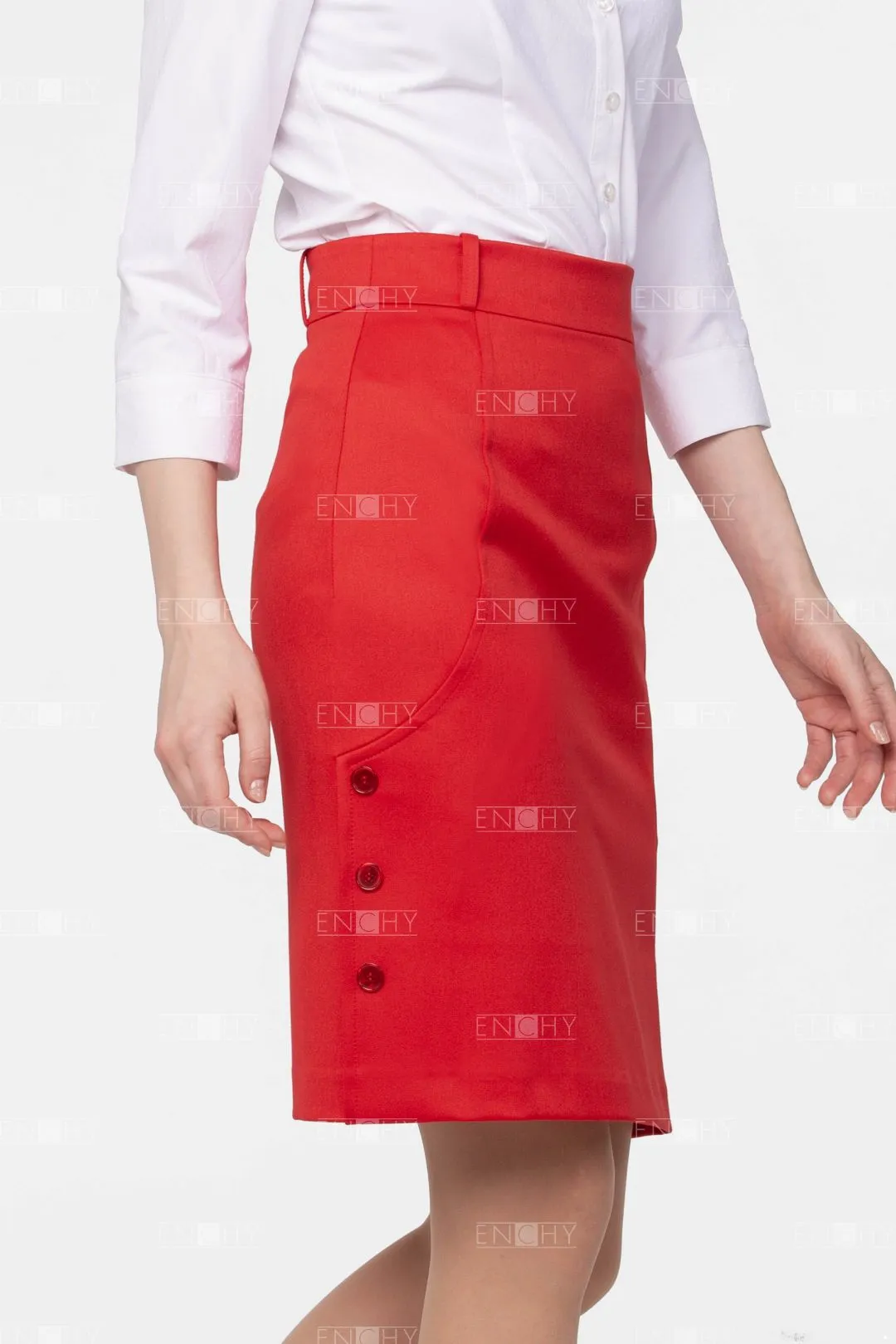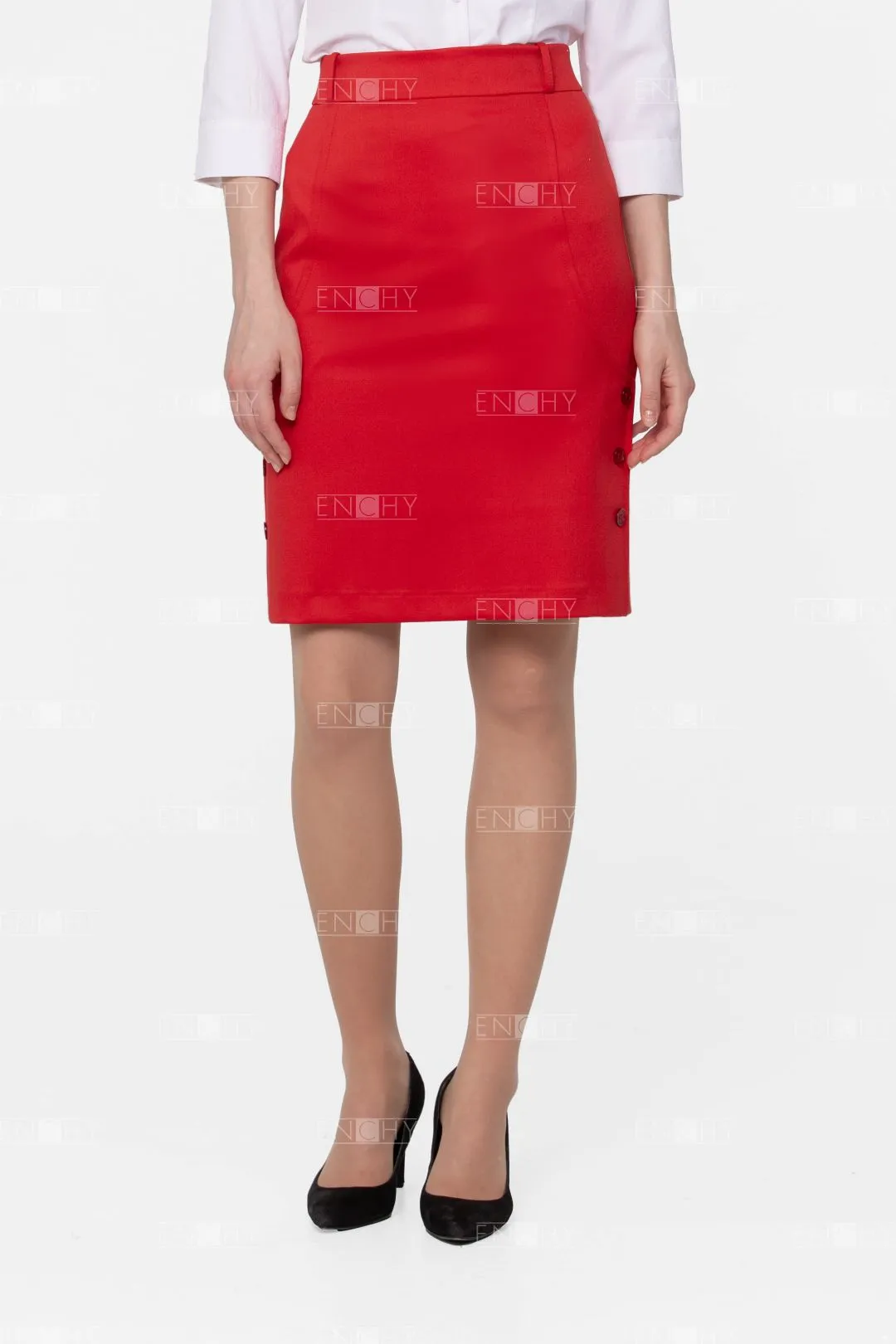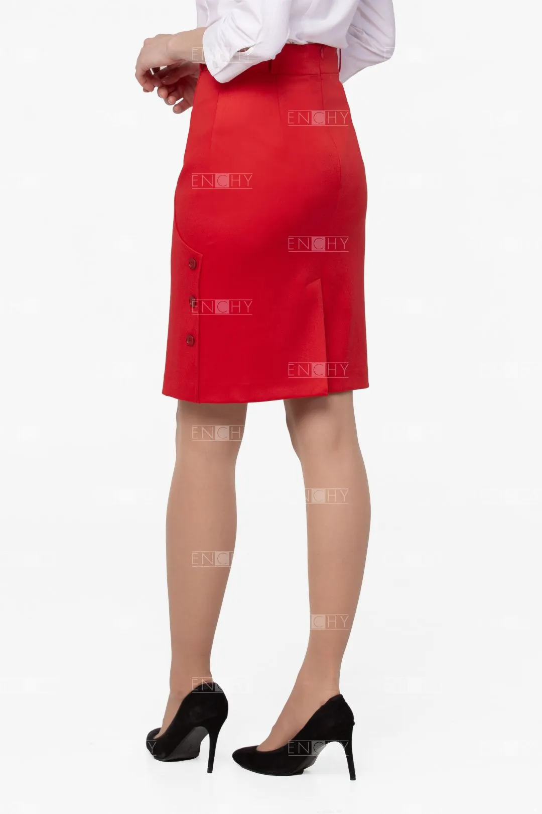Юбка на подкладке на талии на широком поясе. Спереди декоративные рельефы и пуговицы.