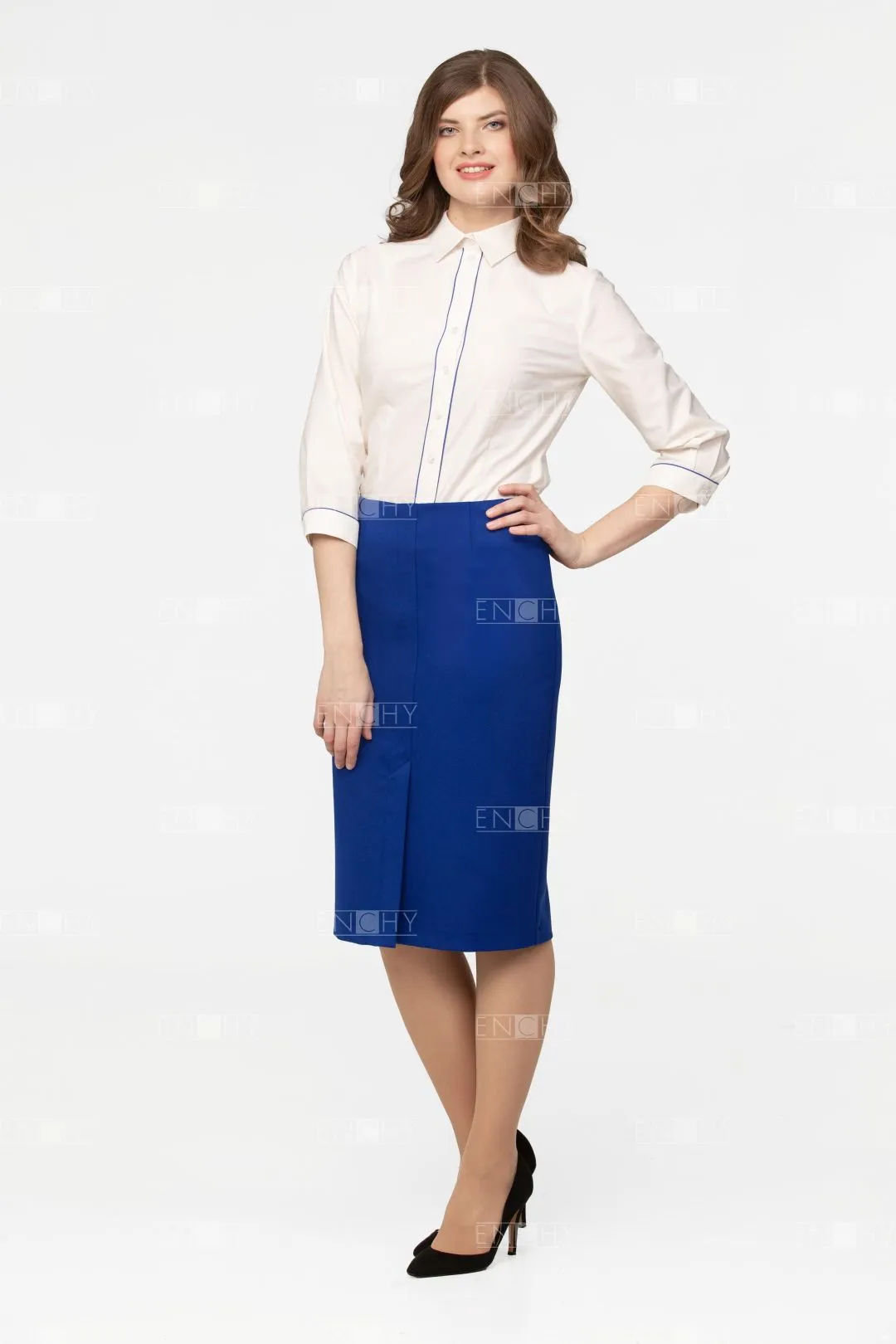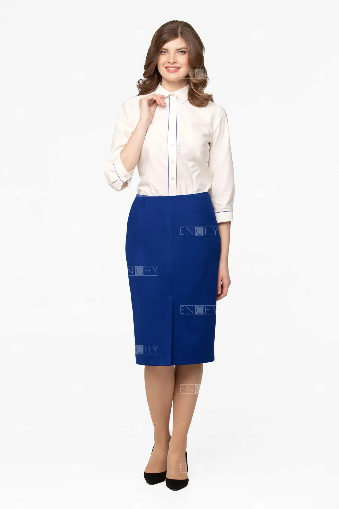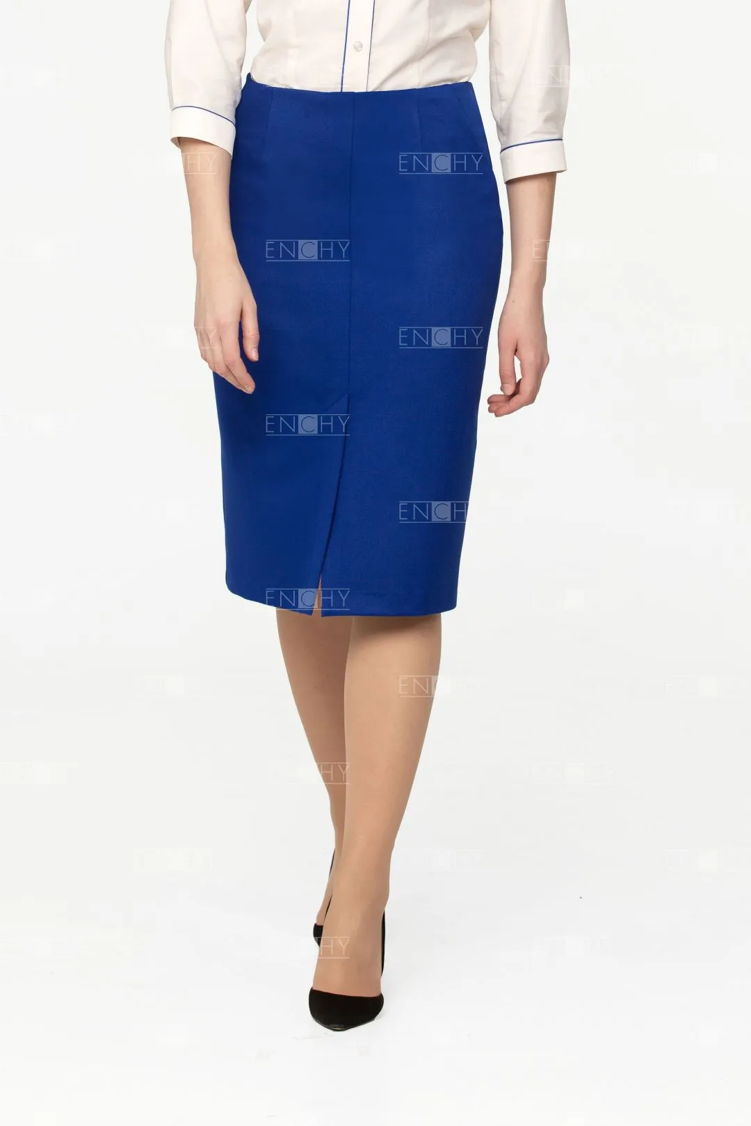 Юбка без пояса, посадка чуть ниже талии, длина ниже колена. Спереди декоративные швы иммитирующие карманы. по центру отстроченная шлица.