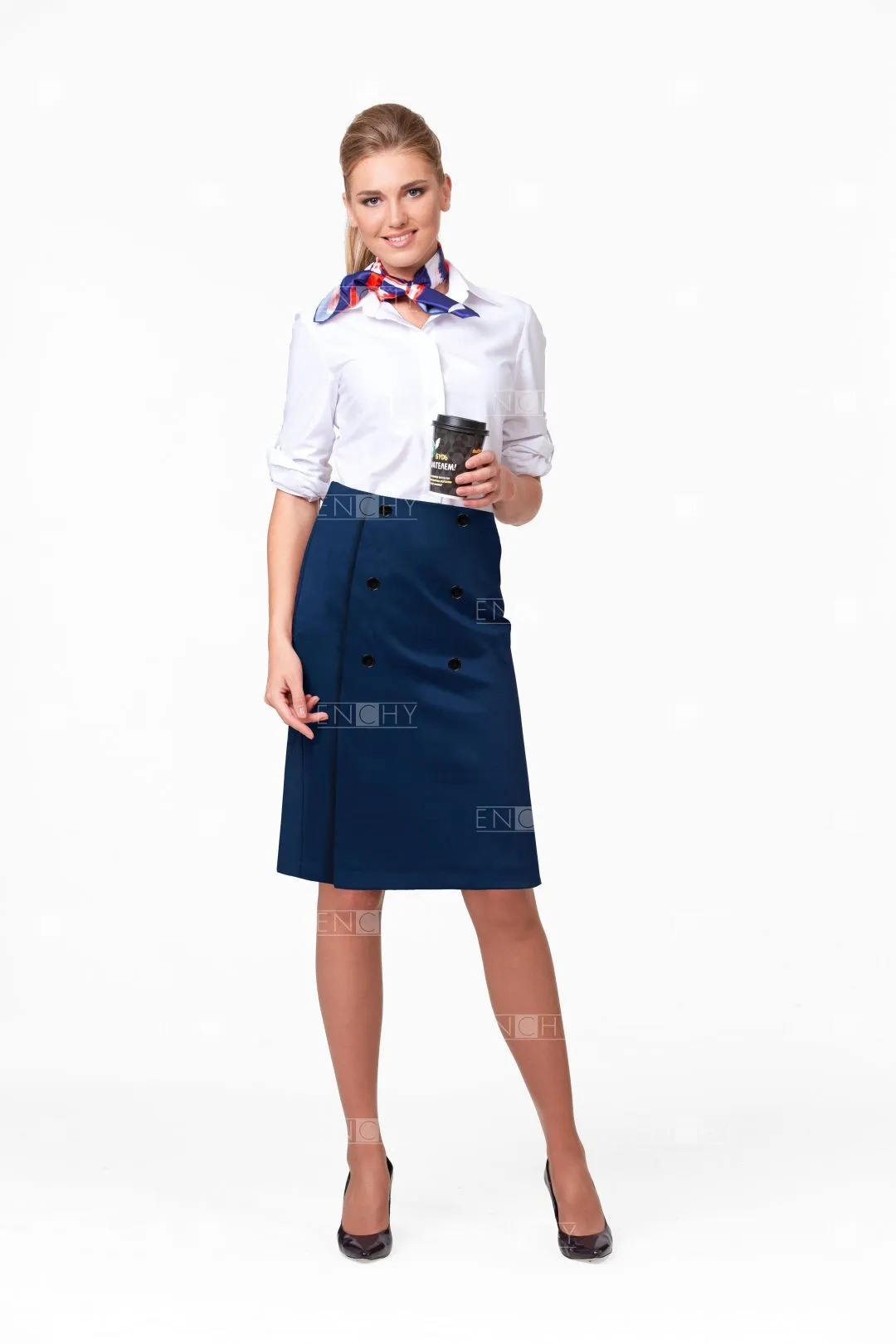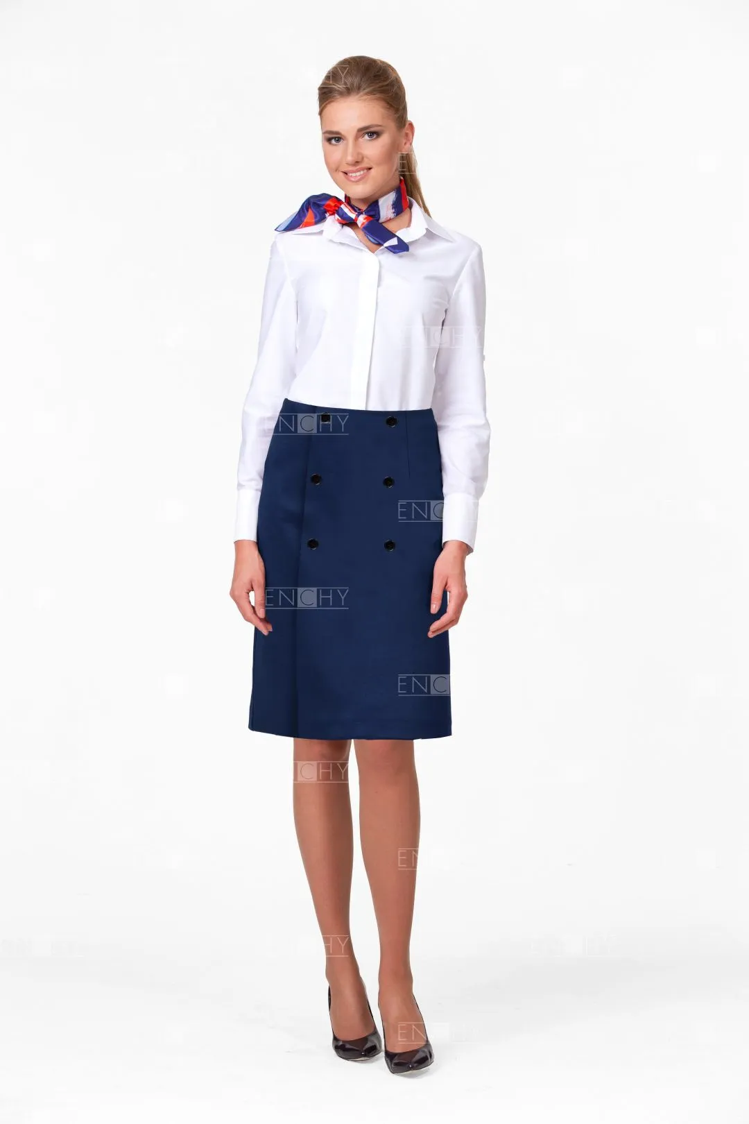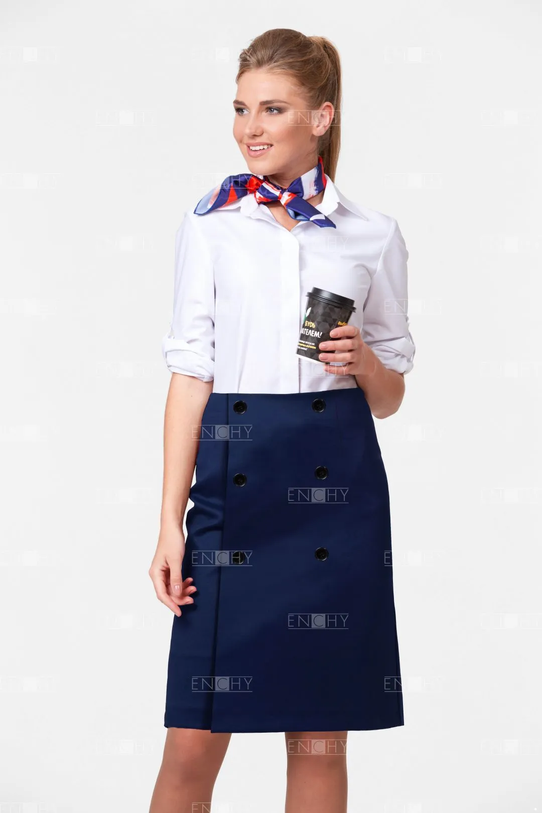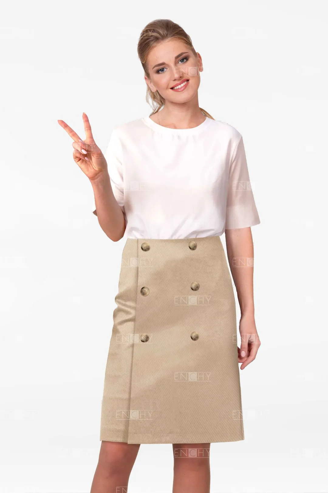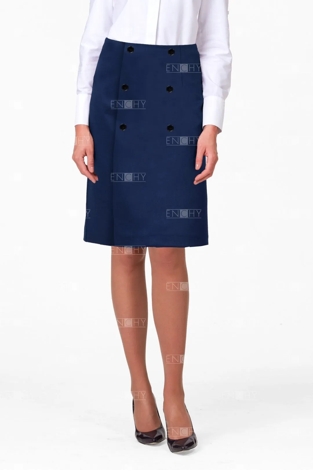Двубортные вещи всегда выглядят особенно элегантно в корпоративной одежде, и эта юбка не исключение! Посадка на талии, небольшое расклешение к низу, и конечно застежка на 3 ряда пуговиц. Такой силуэт будет гармонично смотреться в деловых образах, и в расслабленных с футболкой и кедами!