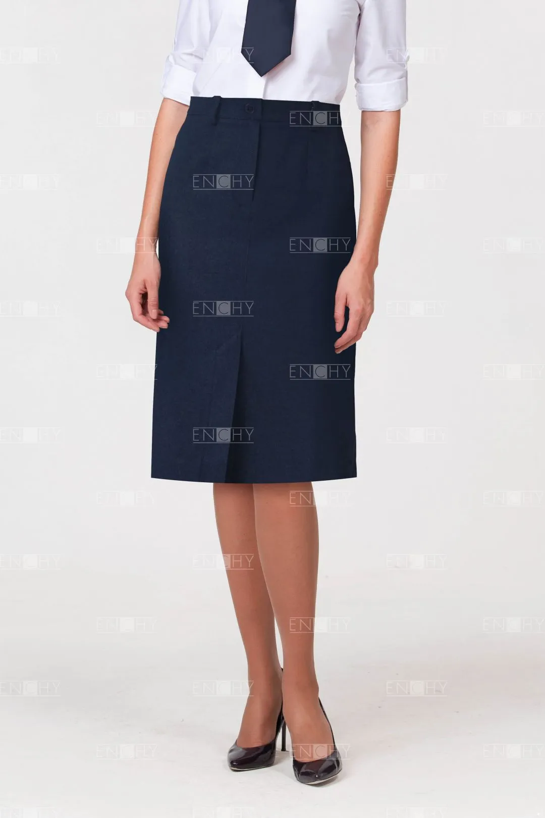 Прямая юбка с посадкой на талии, длиной до колен, с застежкой на гульфик и откосок. Спереди спроектирована шлица для удобства, на поясе несколько шлевок.