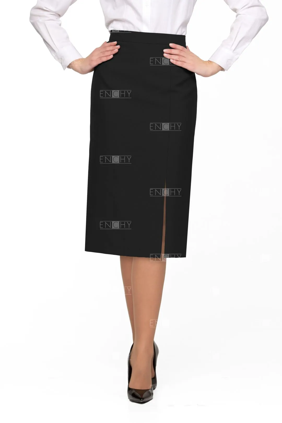 Прямая юбка длиной ниже колена, на притачном поясе. Изюминка модели в разрезе на переде высотой чуть выше колена. Перед и спинка с талиевыми вытачками, застежка на потайную тесьму-молнию в среднем шве спинки и петлю и пуговицу на поясе.