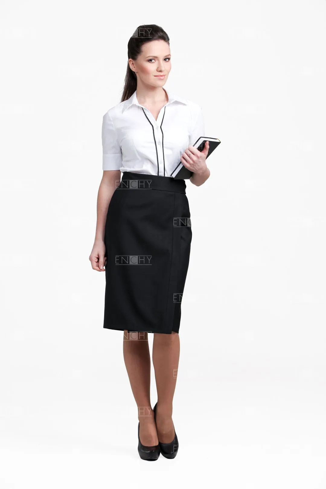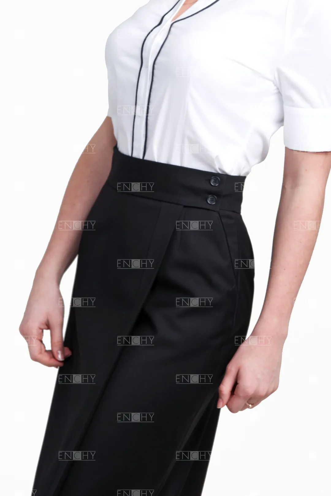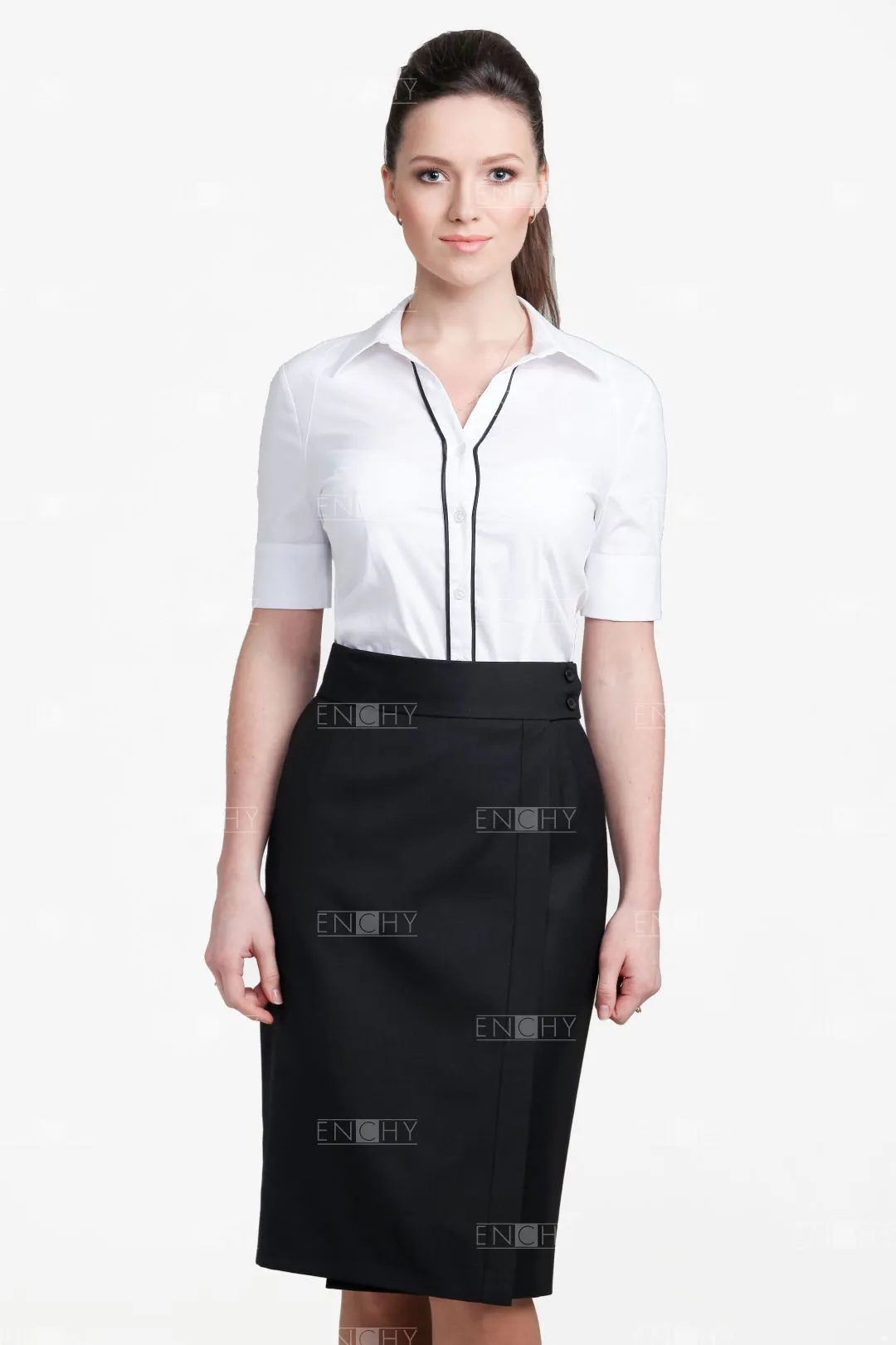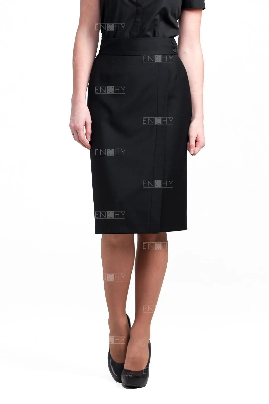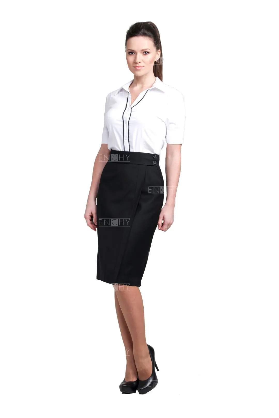 Юбка с запахом - отличное решение! Юбка с широким поясом застегивается на 2 потайные и 2 видимые пуговички. Юбка декорирована отрезной полосой вдоль линии запаха, которую можно выполнить в контрастном цвете, подчеркнув основные фирменные цвета вашей компании. По бокам наклонные карманы, которые возможно украсить контрастным кантом. По желанию клиента, пояс юбки можно сделать любой ширины.