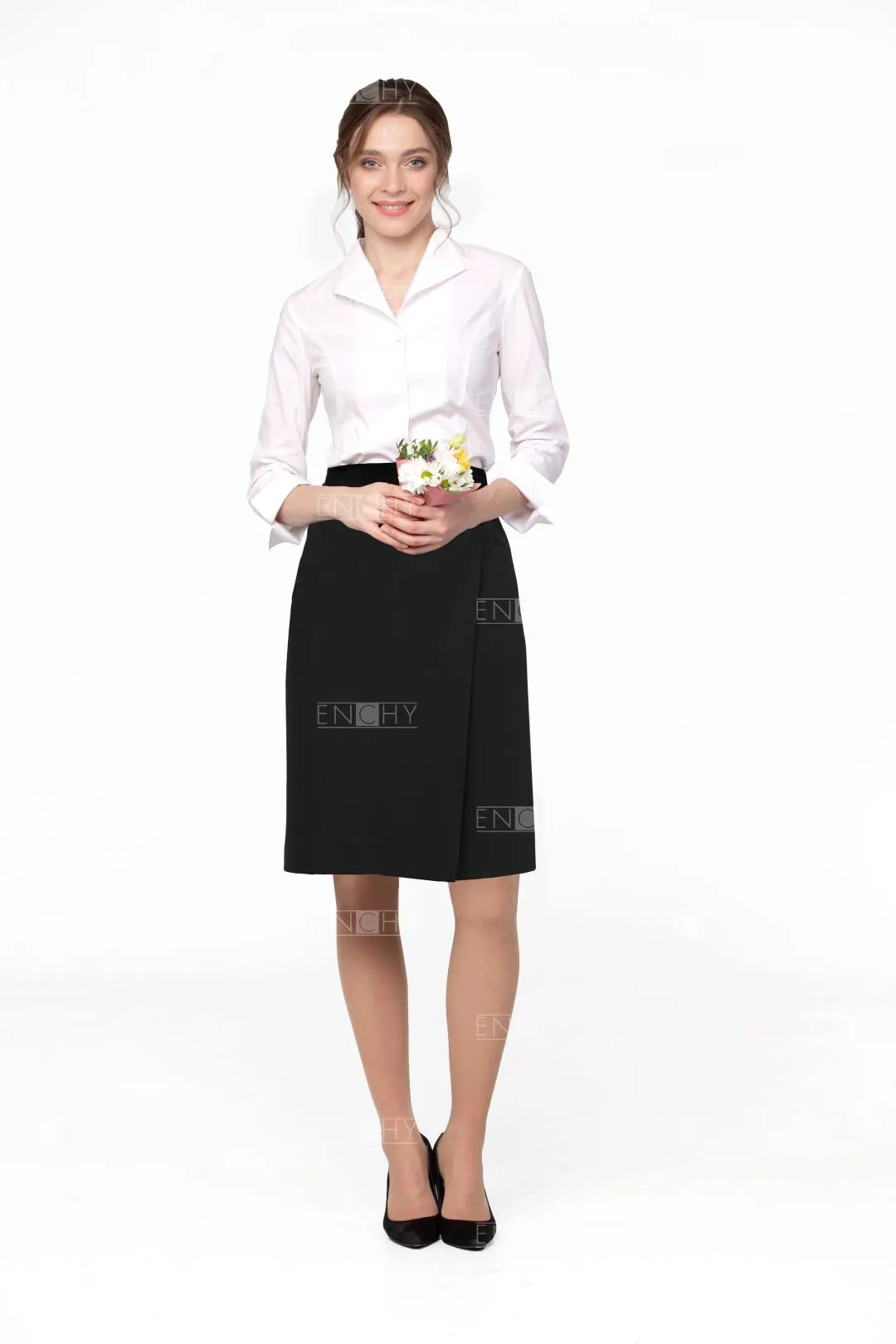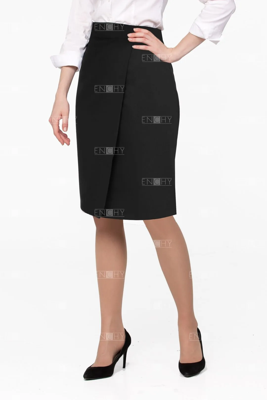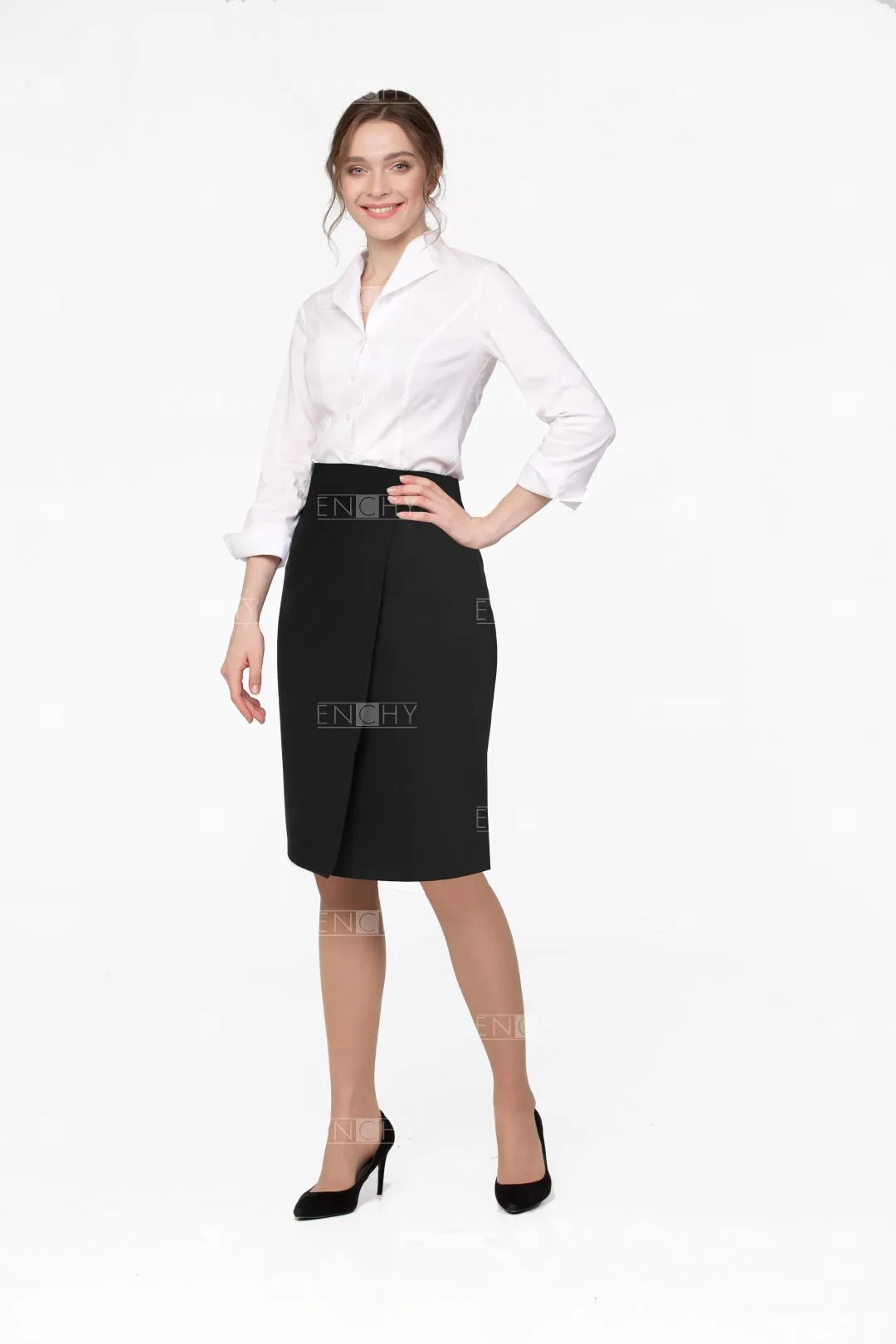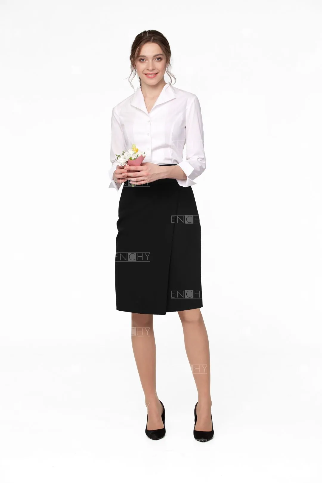 Юбка на запах остается актуальной на протяжении многих сезонов благодаря своей универсальности. А также это отличный вариант для компаний с часто сменяющимся коллективом. Широкий пояс находится на линии талии. Застежка на потайную пуговицу и на пуговицу на правом полотнище. Линия запаха декорирована кантом, который может быть выполнен в контрастном корпоративном цвете.