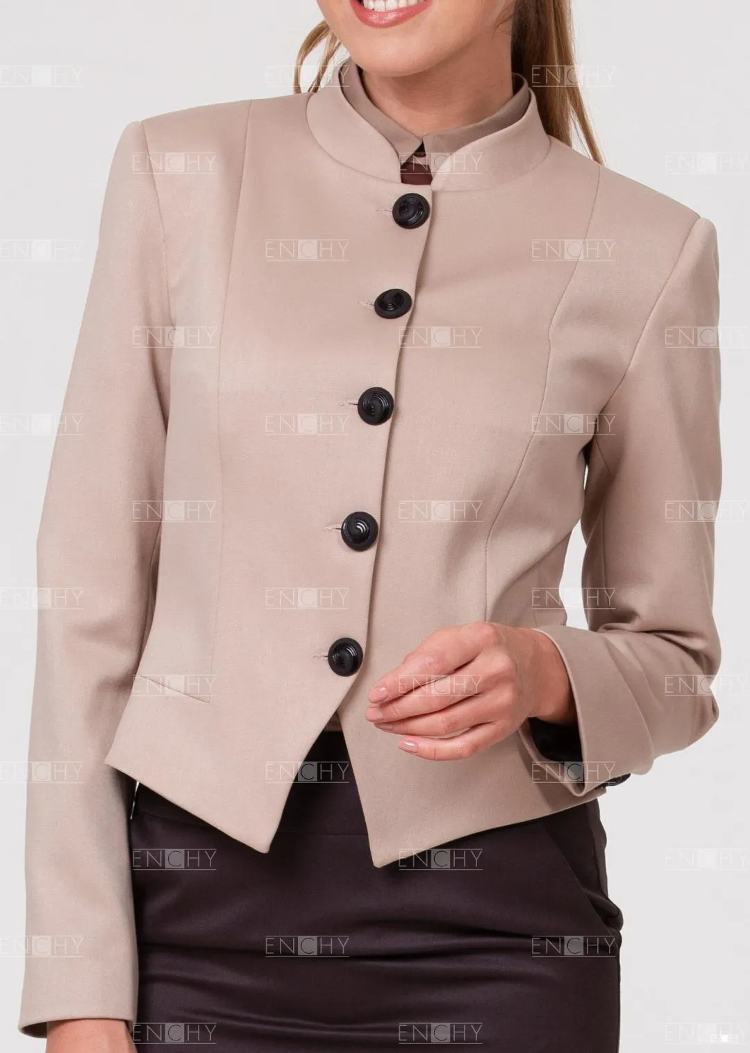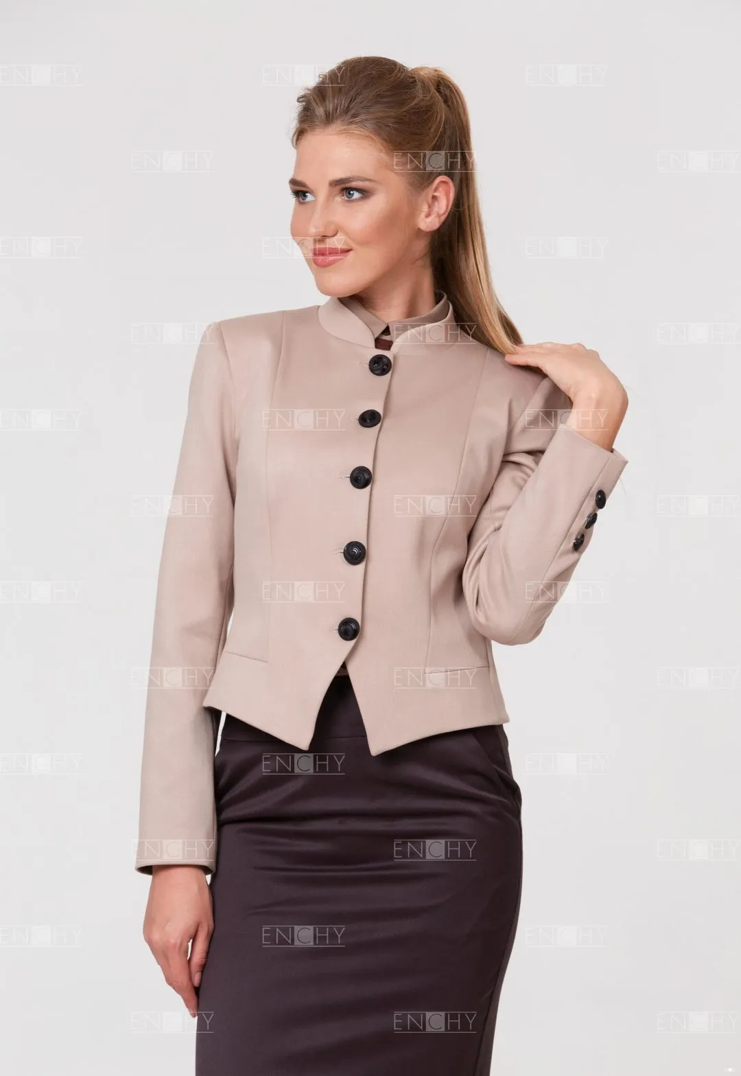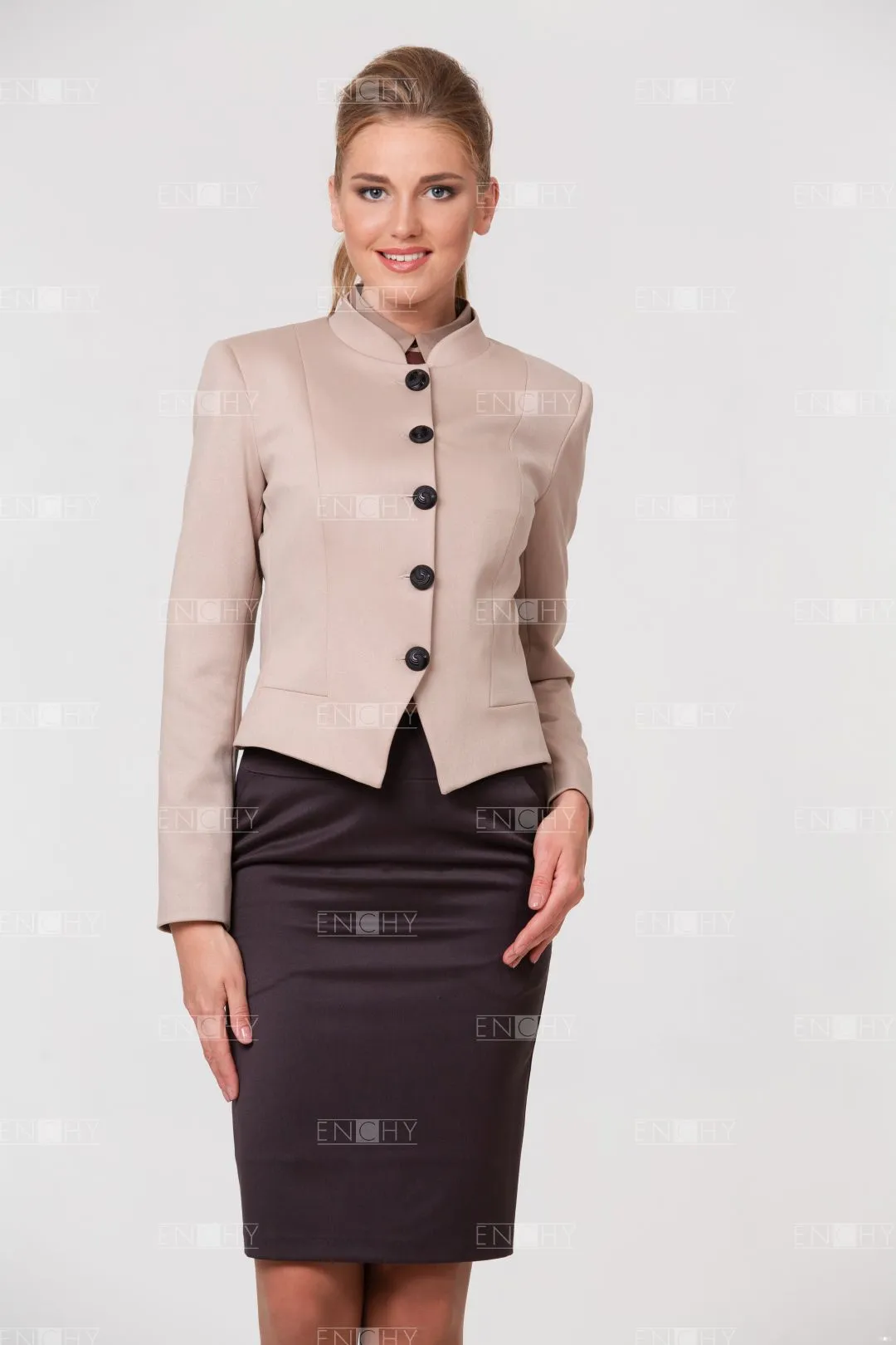 Жакет с воротником-стойкой подойдет как для офисных сотрудников, так и для персонала на банкетах. Жакет полуприлегающего силуэта, с фигурными рельефами, которые можно украсить тесьмой или кантом. Нижняя часть борта фигурная.