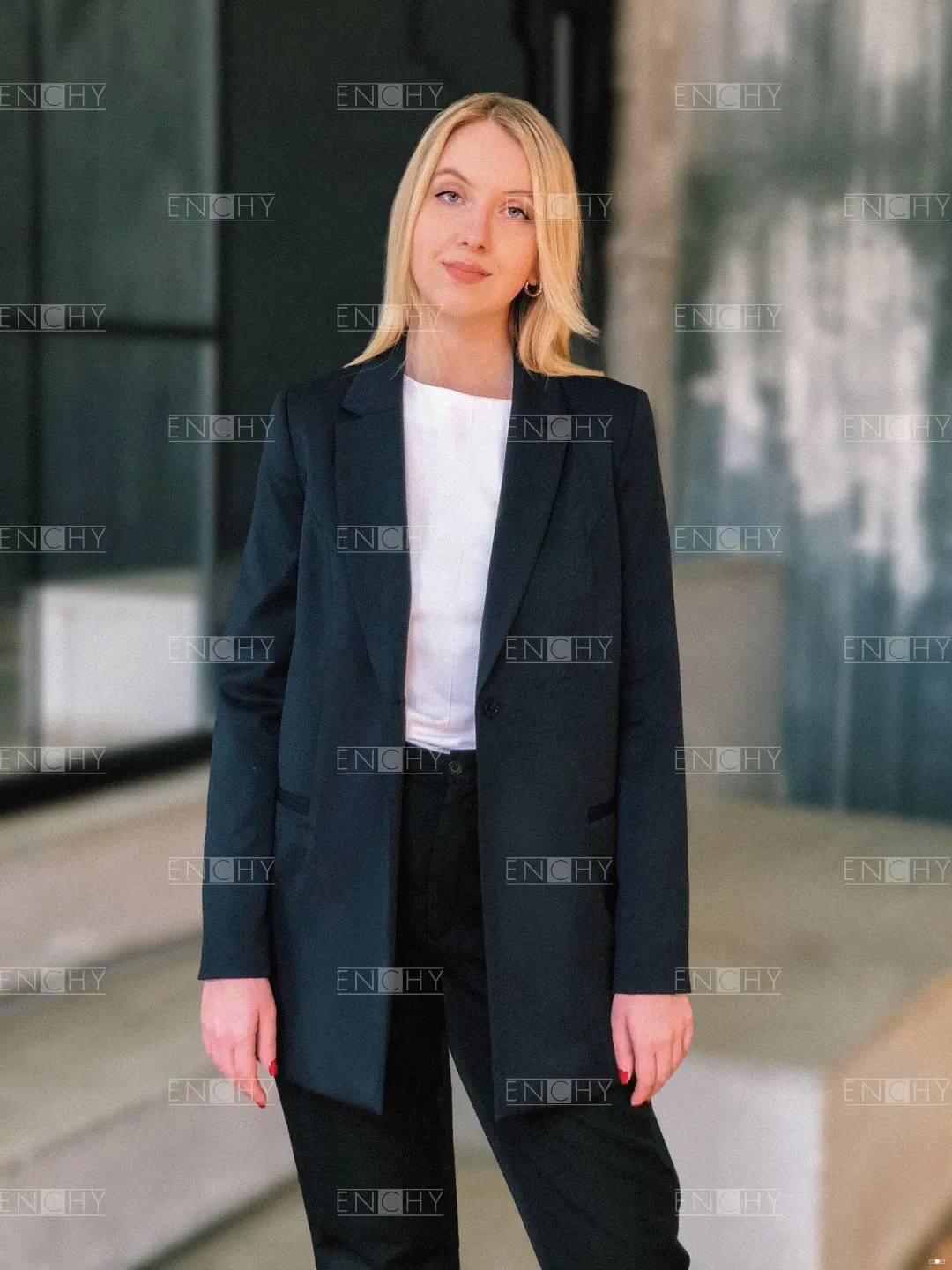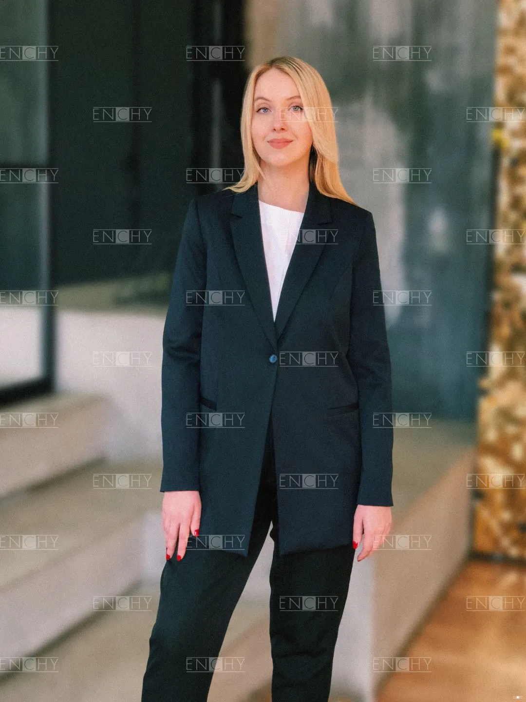 Удлиненный жакет со стояче-отложным воротником с лацканами гарантирует презентабельный внешний вид ваших сотрудников. Этот жакет покоряет минималистичным кроем и прямым, oversize силуэтом. Перед с рельефными швами и прорезными карманами с листочками на боковых деталях переда. Рекомендуем на любые размеры.