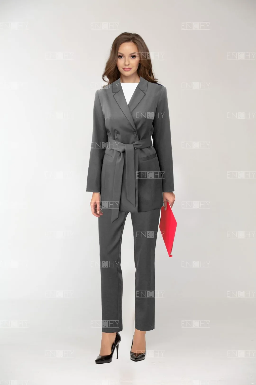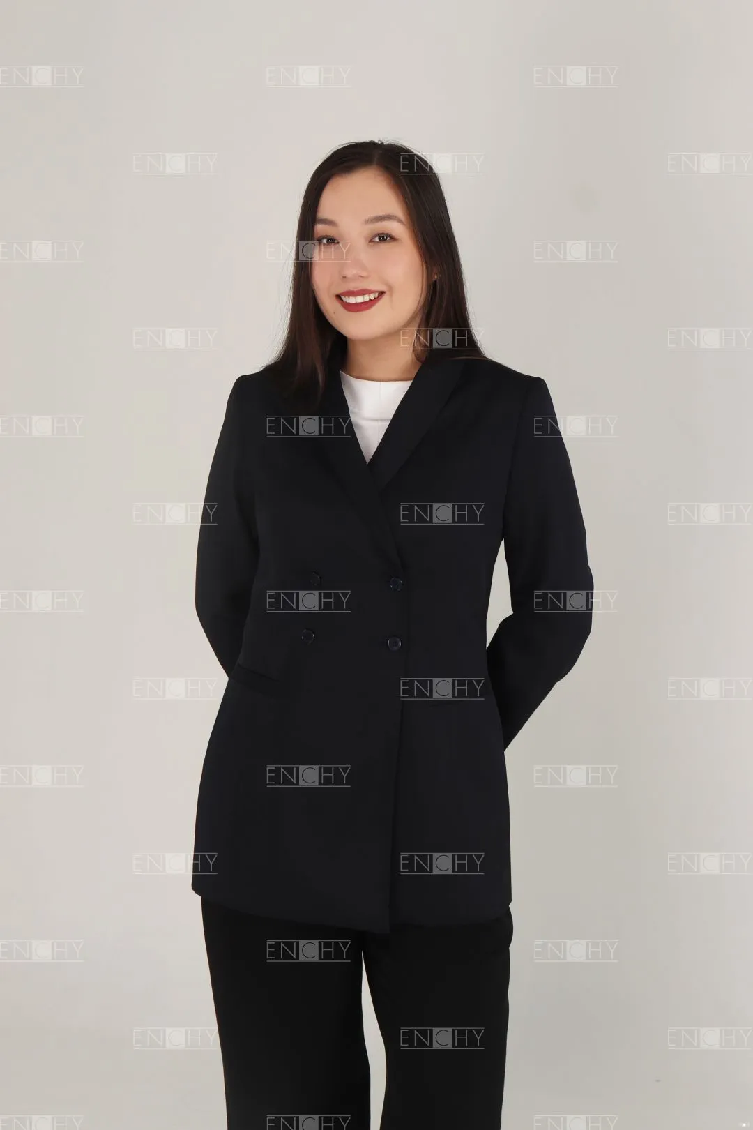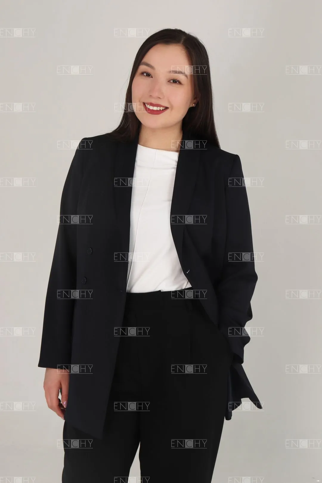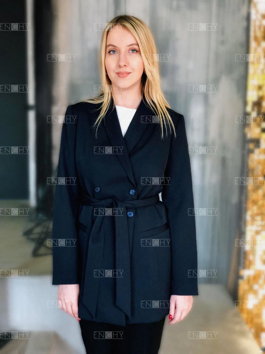 Жакет стильного кроя позволит создать деловой образ с учетом последних модных тенденций: двубортная застежка на 2 пары пуговиц, красивая линия выреза обрамлена актуальным воротником шаль, перед оформлен двумя рельефами и вытачкой. Прорезные карманы с листочкой - всегда удобный элемент в деловой моде. Жакет можно носить с завязывающимся поясом и без.