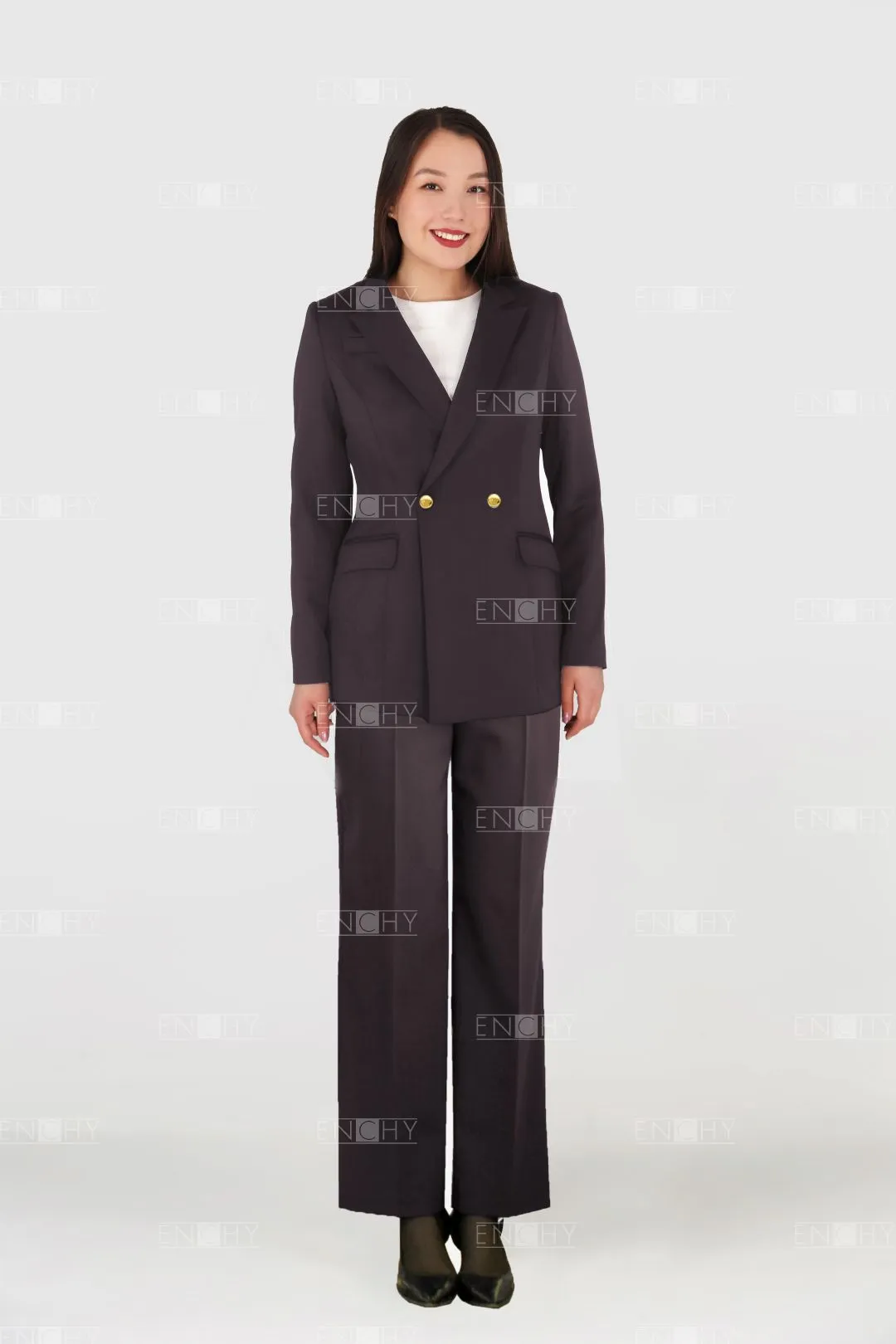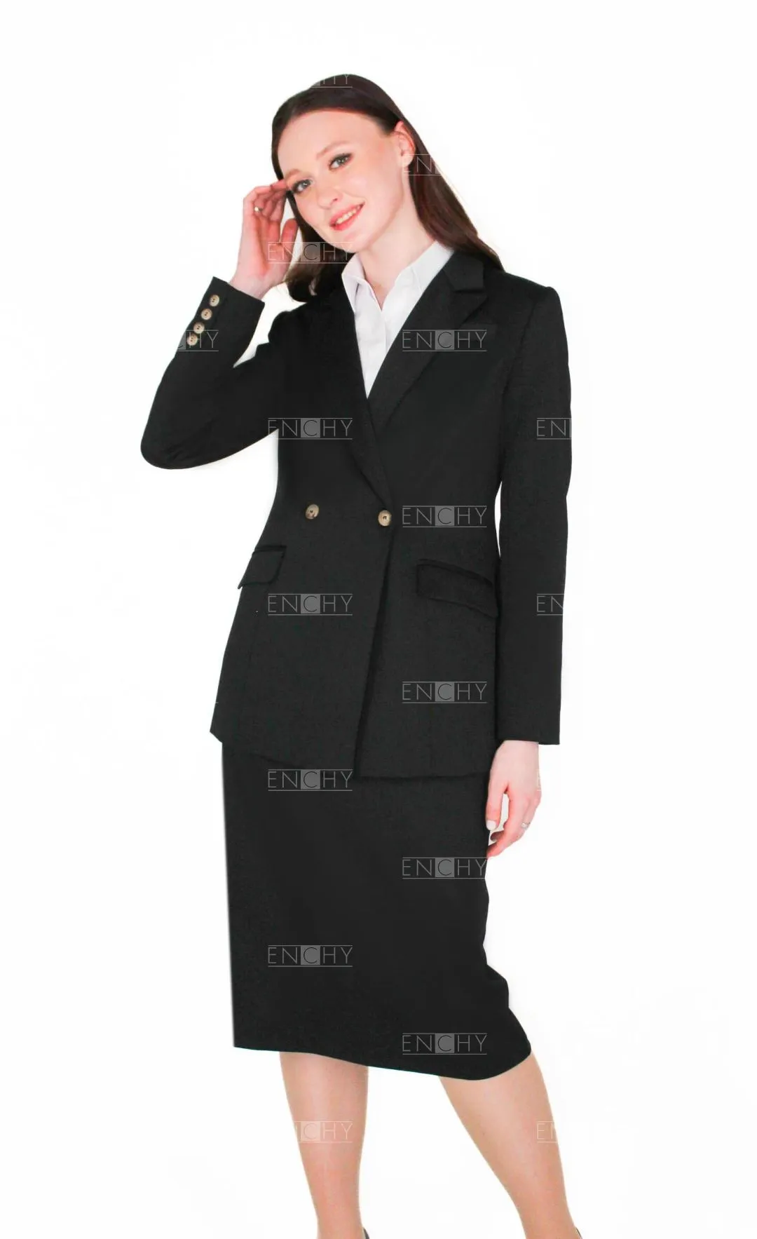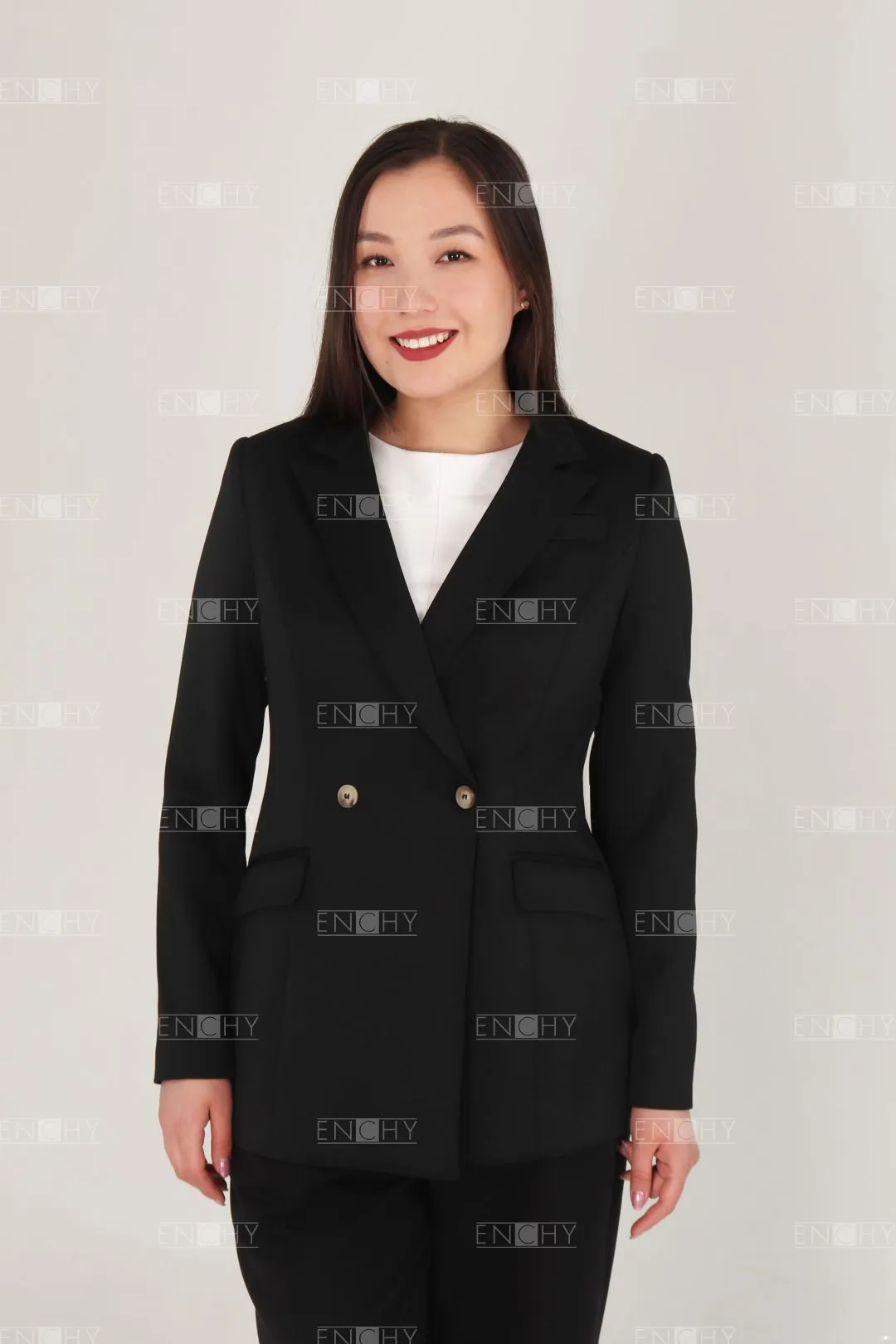 Стильный удлиненный двубортный жакет станет любимой вещью в гардеробе Ваших сотрудниц! Жакет с отрезным бочком, имеет слегка приталенный силуэт. На переде два прорезных кармана в рамку с клапанами и наклонным входом, верхняя листочка имеет декоративную функцию. Спинка со шлицей, в локтевых швах имитация шлиц с декоративными пуговицами.