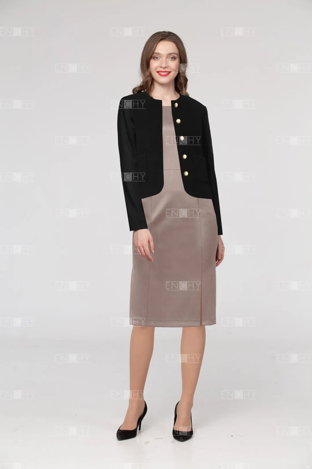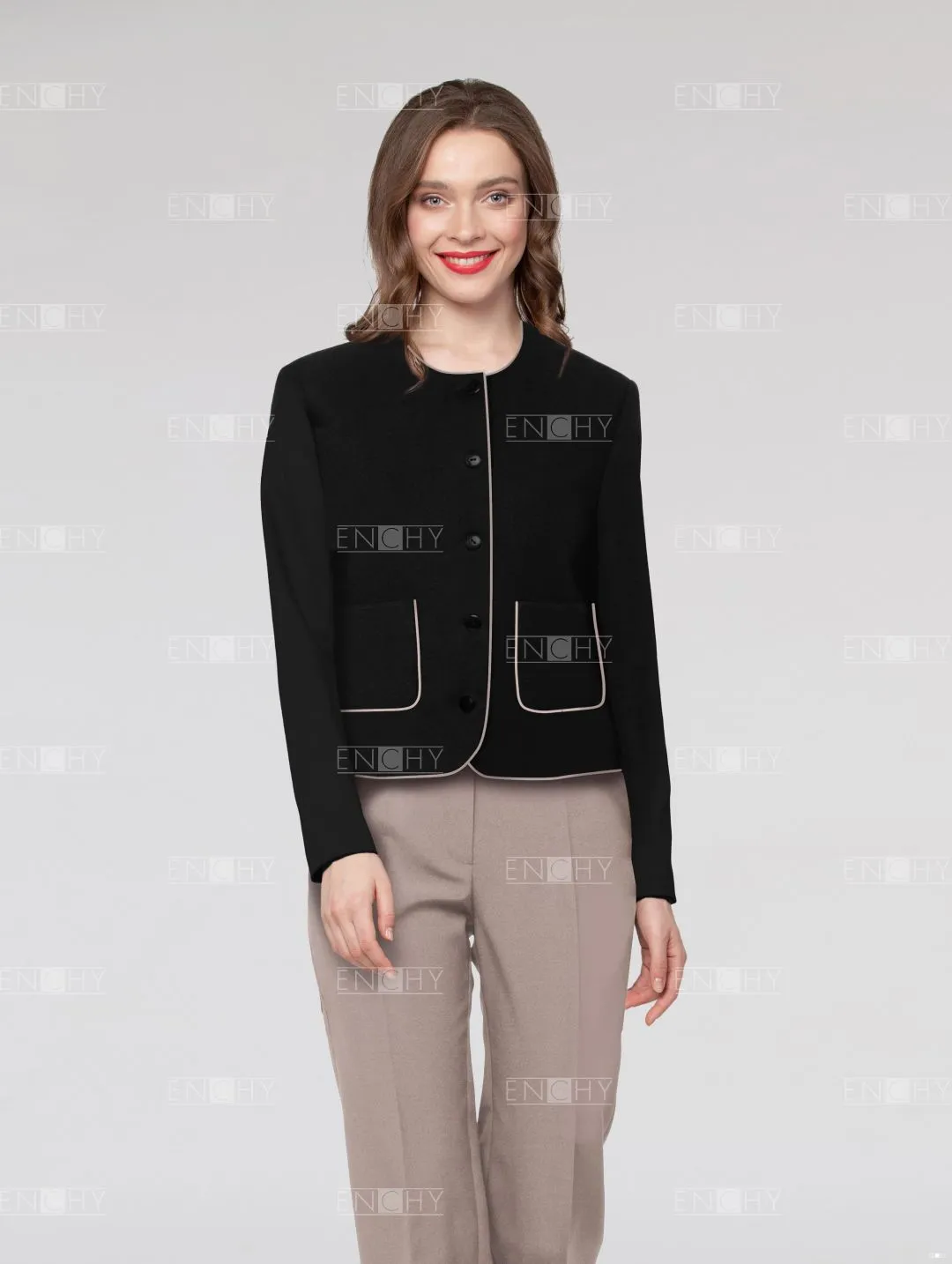 Классический укороченный жакет без воротника с круглым вырезом горловины— сама женственность и утонченность!Форма с отсылками к знаменитым жакетом от "Chanel". Силуэт чуть приталенный, с отрезным бочком. Перед с двумя накладными карманами, застежка на пуговицы до верха. Жакет можно дополнить отделкой кантами и пуговицами!