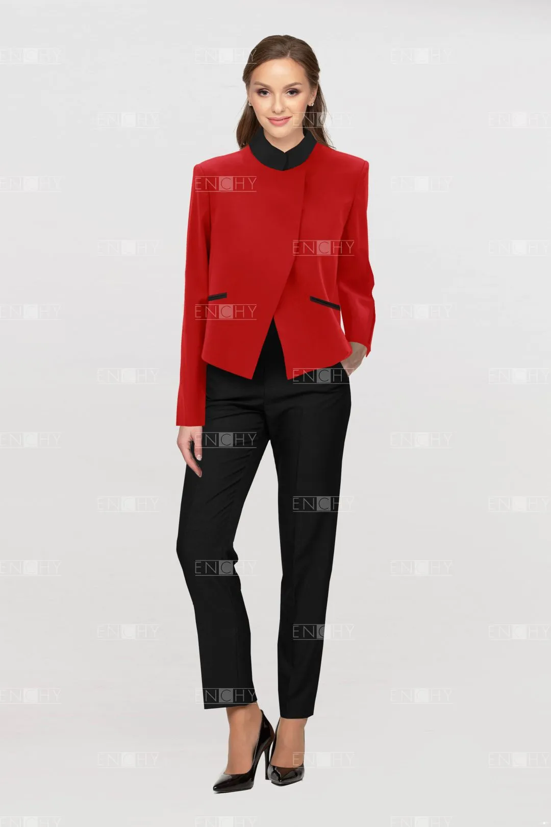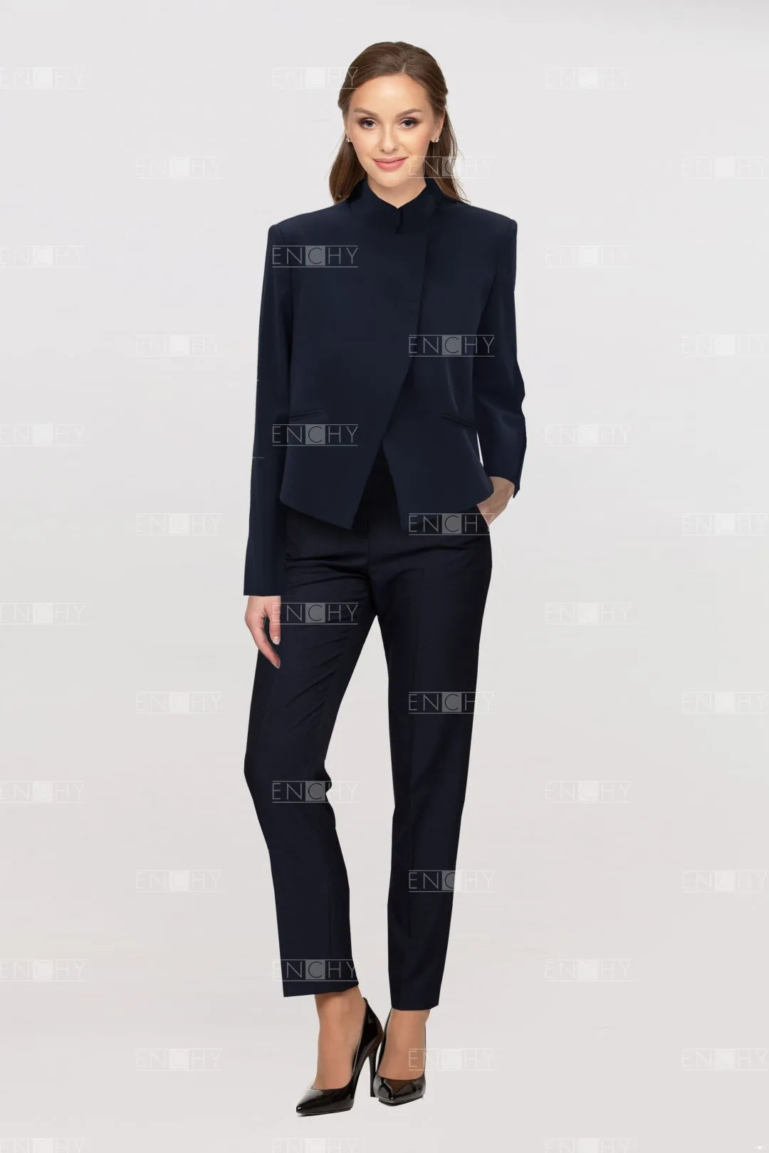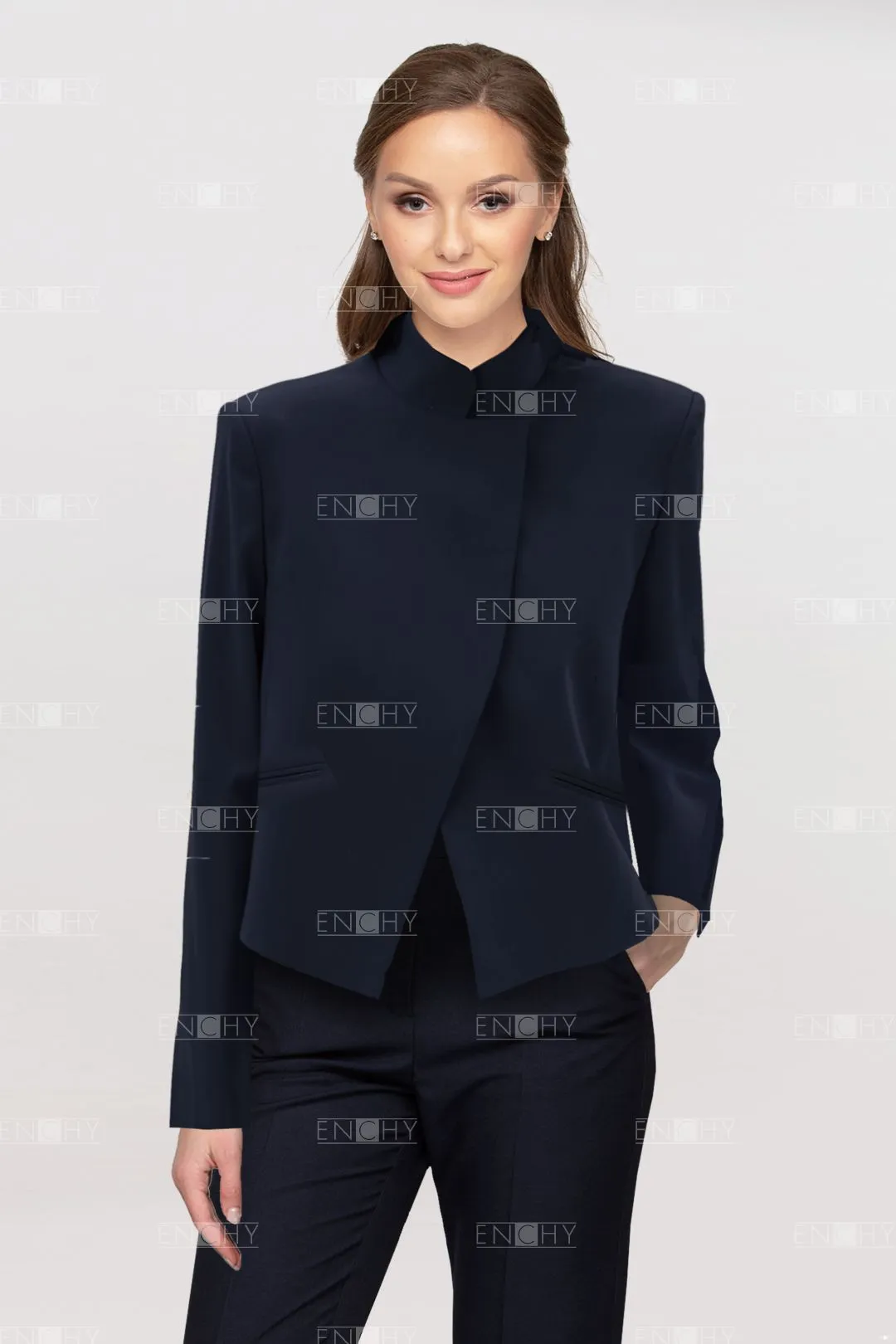 Необычный укороченный жакет с воротником стойкой и скошенным краем борта. Перед с боковыми прорезными карманами в рамку. Высокий воротник-стойка, прямой силуэт, потайная застежка на пуговицы. Такая модель жакета будет особенно стильно смотреться с брюками на высокой посадке.