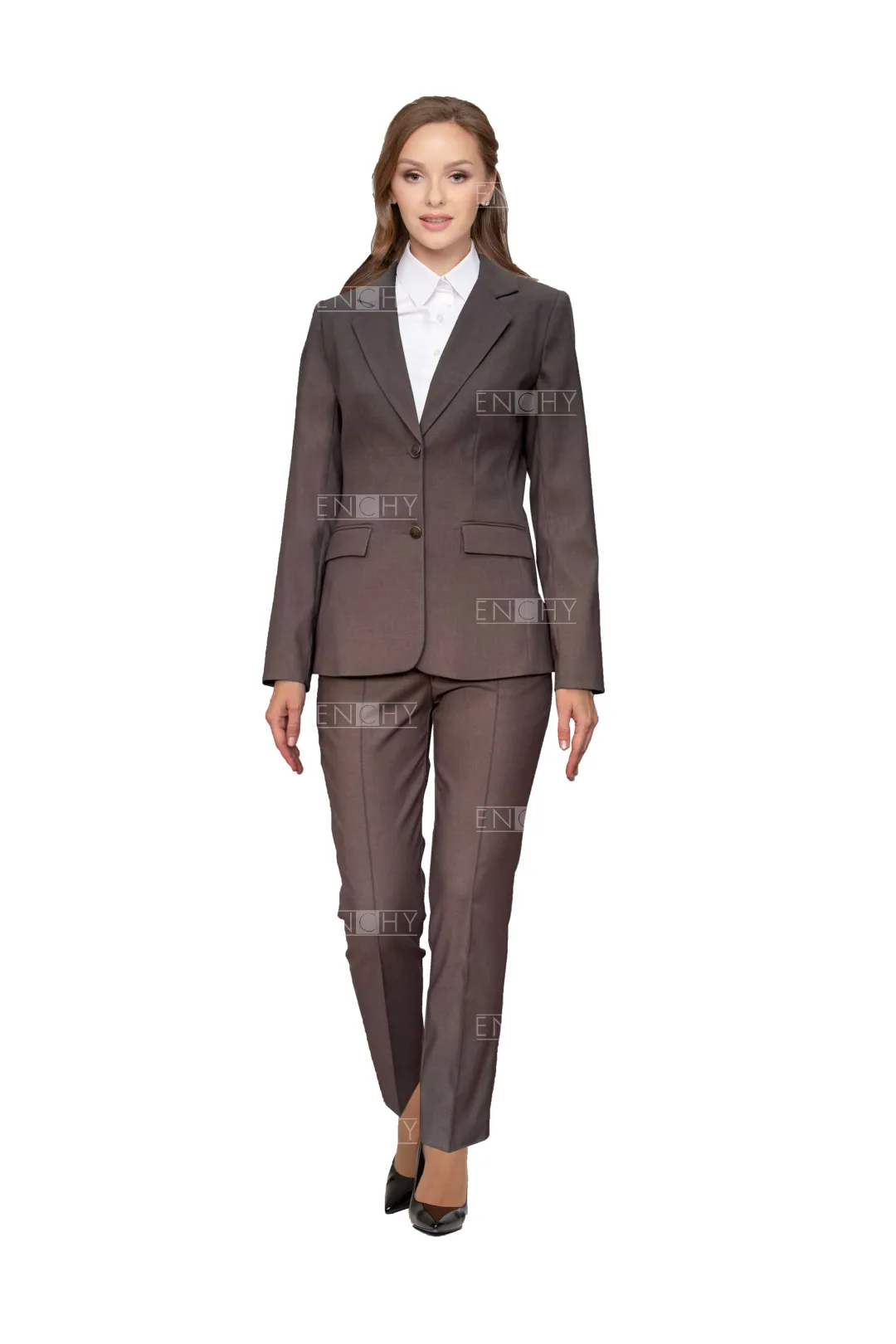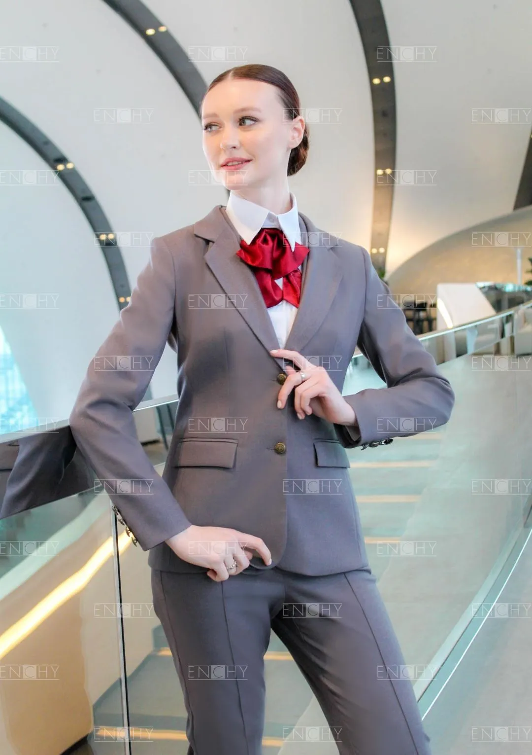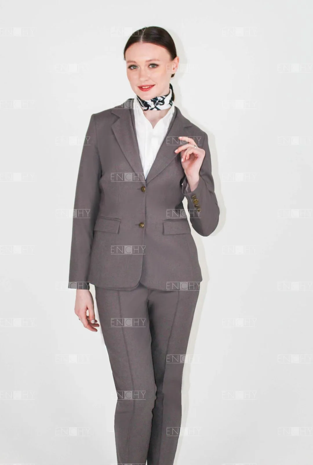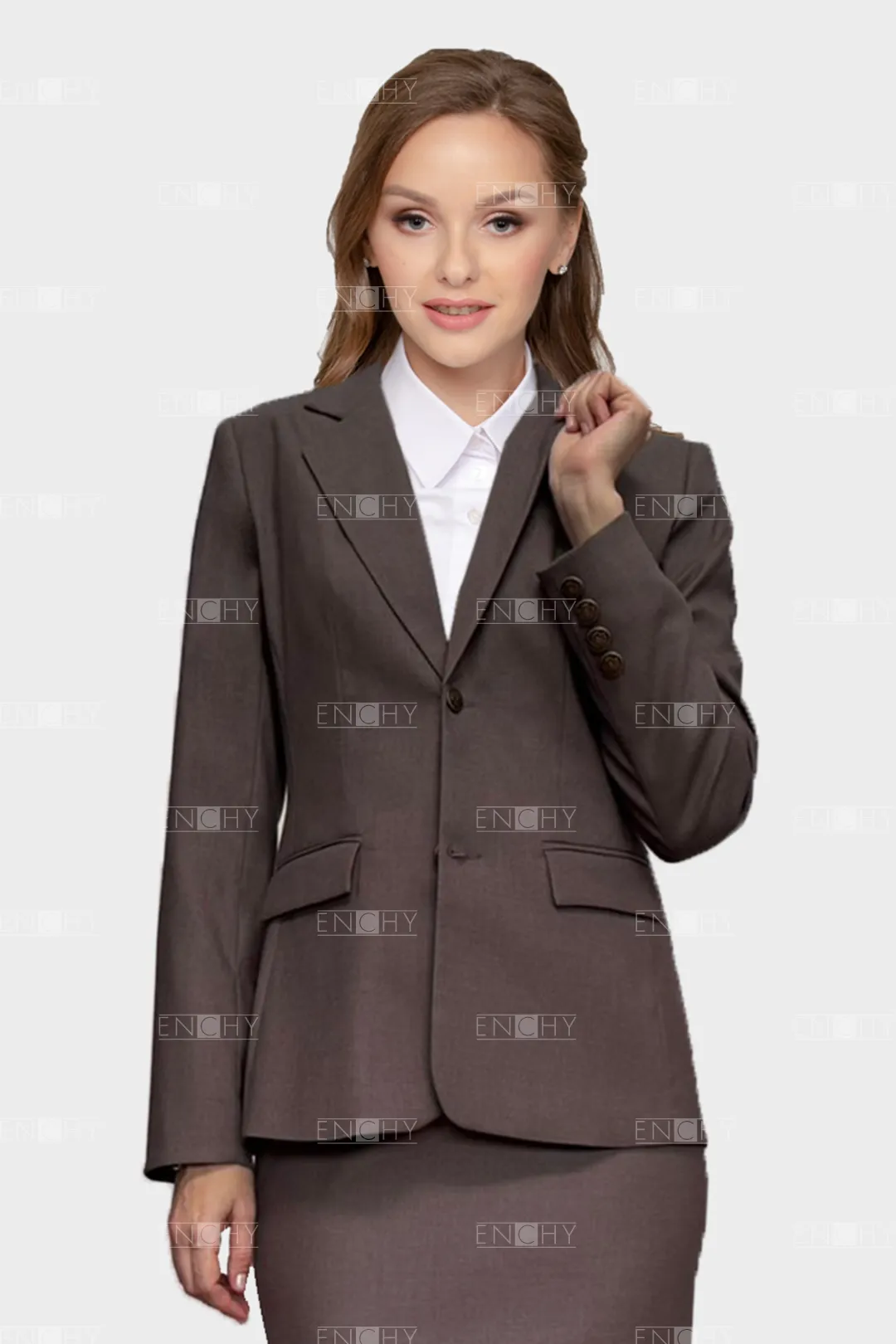 Жакет универсального классического кроя с вытачками и бочками, небольшим стояче-отложным воротником с лацканами и прорезными карманами с клапанами в рамку. Длинный двухшовный рукав декорирован несколькими пуговицами со стороны локтевого шва. Жакет можно брендировать с помощью вышивки или отделки карманов.
