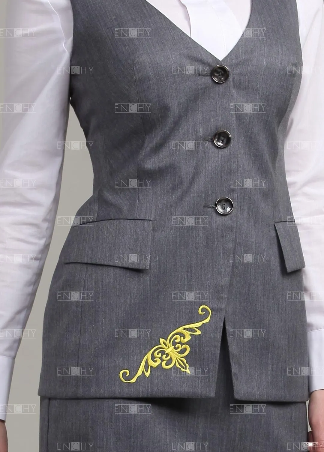 Роскошная форма, удлиненный силуэт - истинный корпоративный шик. Жилет имеет красивый вырез и элегантную линию борта с застежкой на 3 пуговицы. Перед с талиевыми вытачками и рельефными швами, с прорезными карманами с фигурными клапанами. Красивую спинку формирует средний шов, рельефные швы и плечевые вытачки.