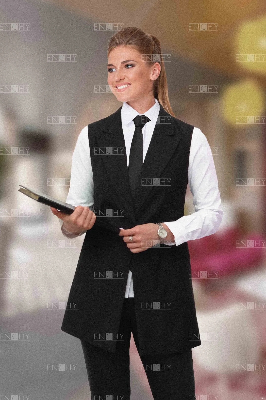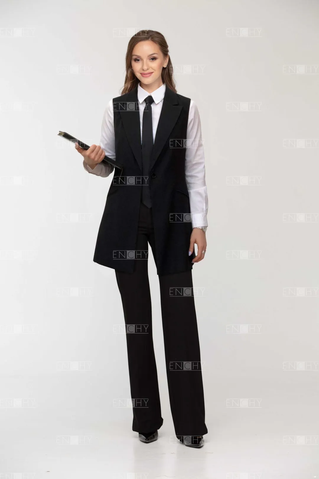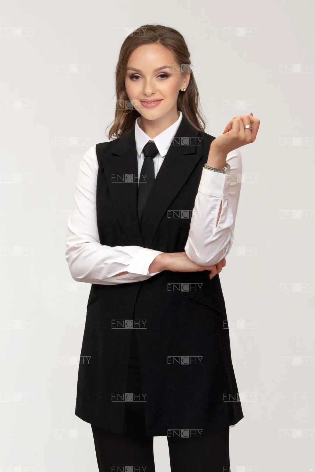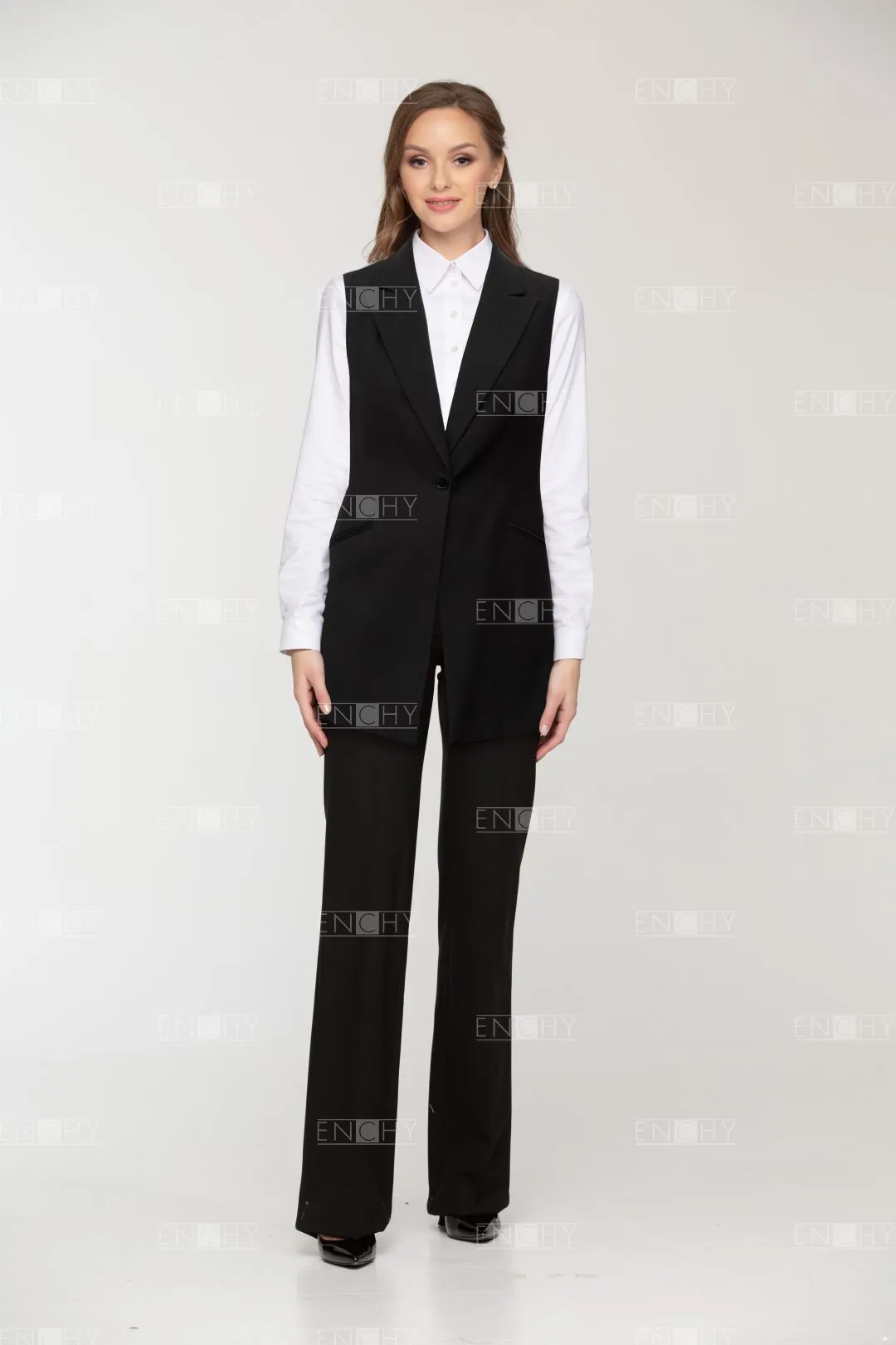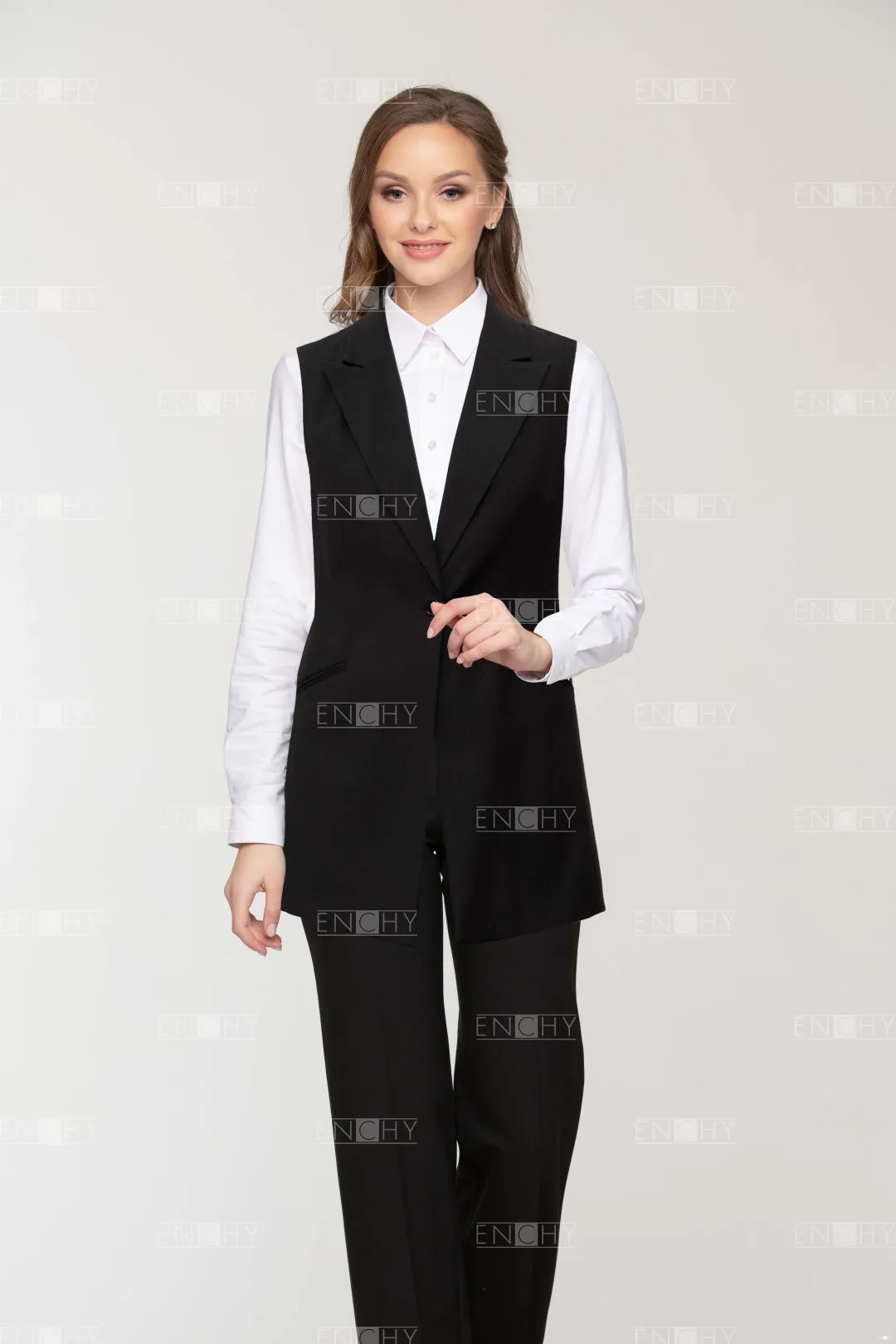 Удлиненный жилет - модная и удобная находка для любой фигуры. Глубокий вырез горловины оформлен стояче-отложным воротником с фигурными лацканами. Рельефы переда и спинки, наклонные прорезные карманы в рамку и застежка на 1 пуговицу— все, что нужно для создания стильного образа!