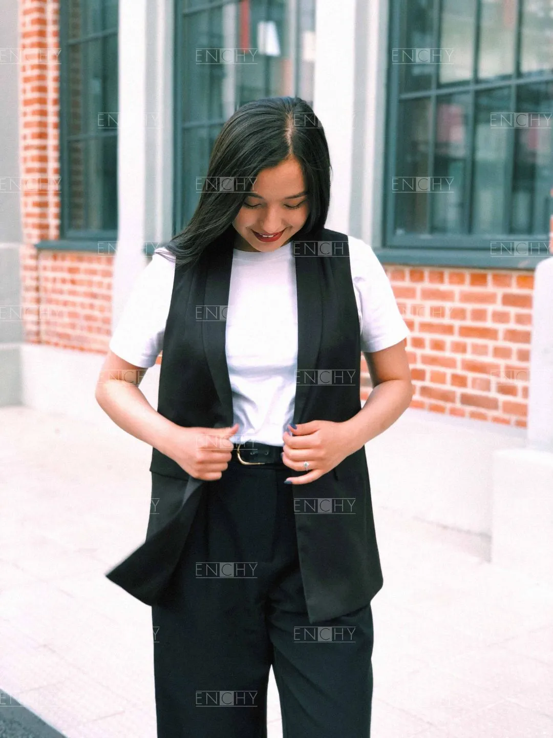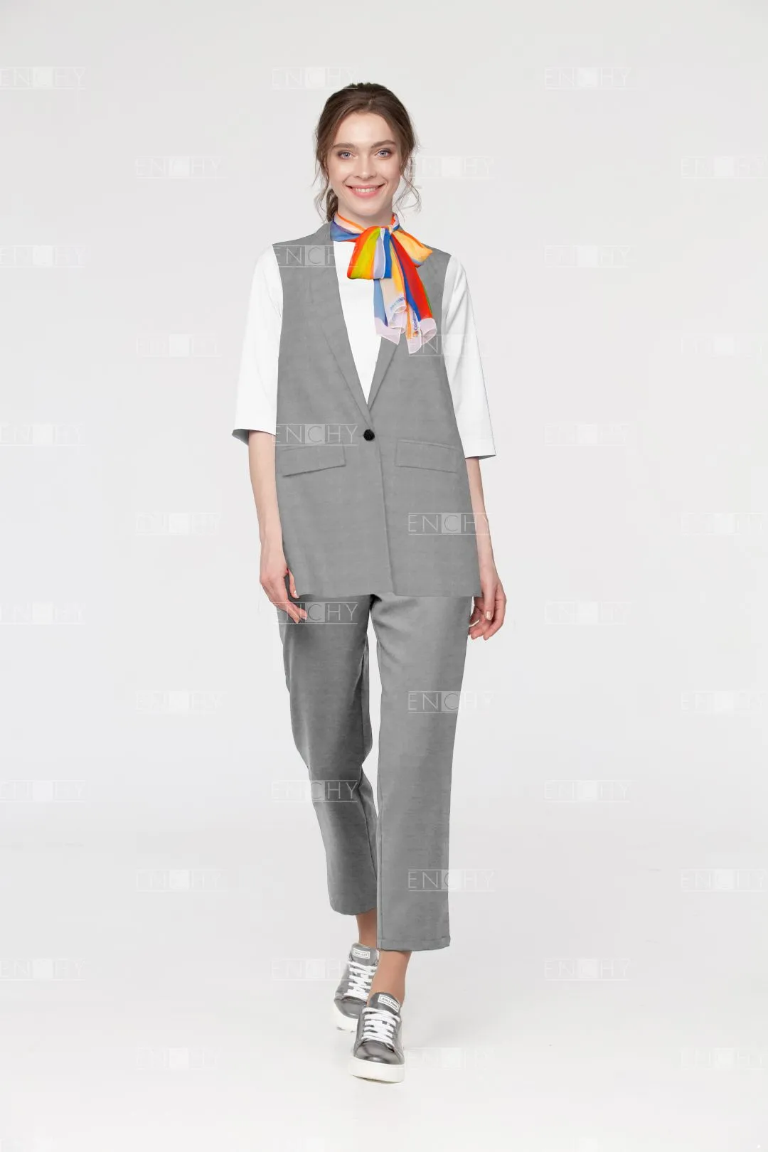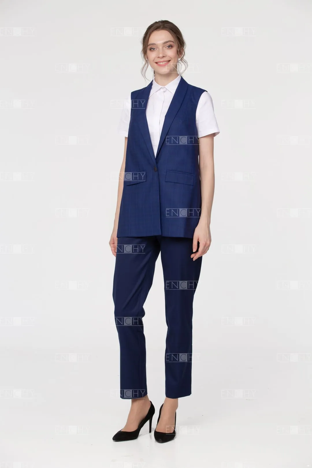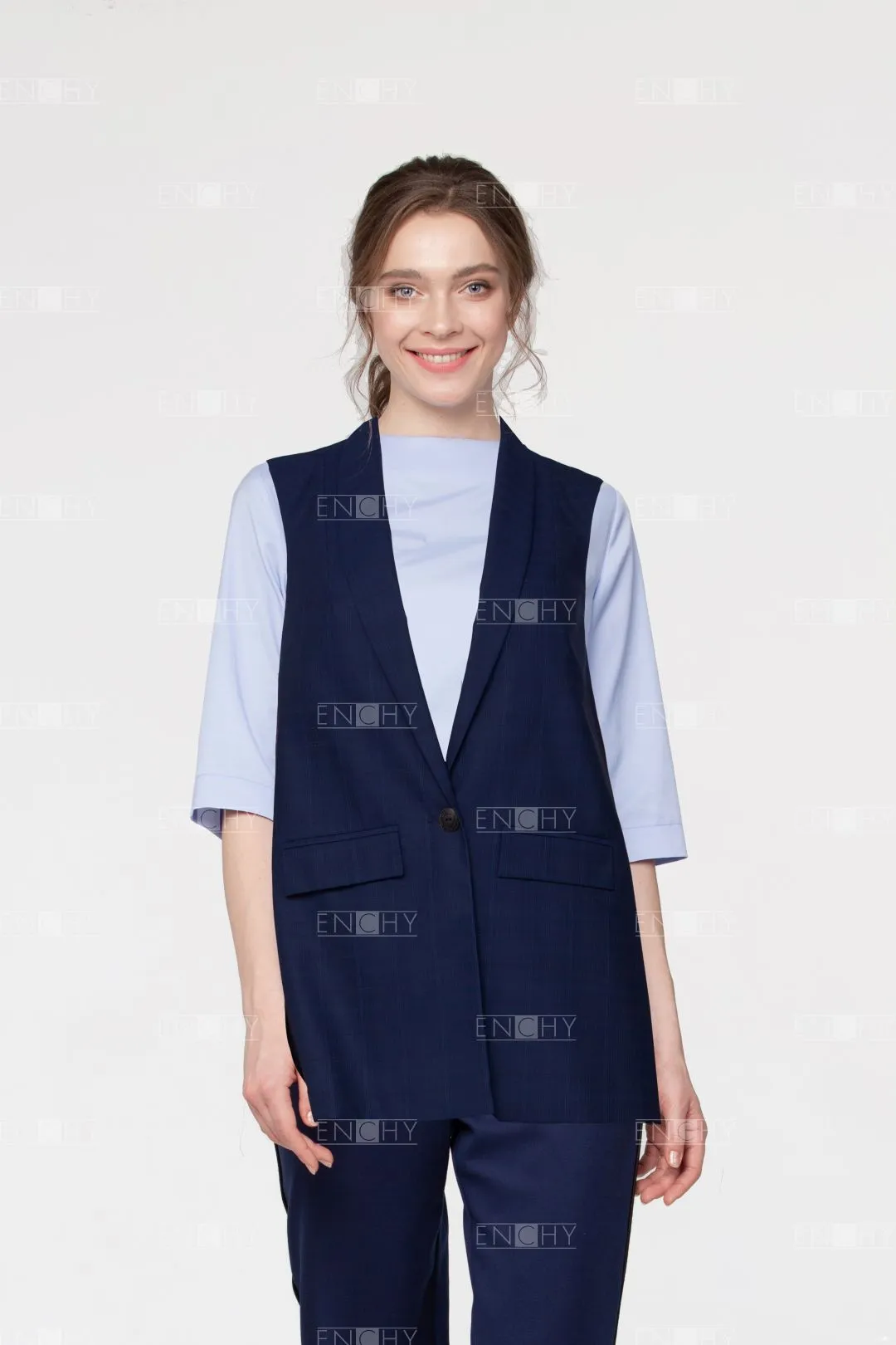 Великолепный вариант для комплекта в стиле casual. Модный свободный крой и шалевый воротник, обрамляющий углубленный вырез добавляет стиля. На переде карманы с клапанами . Жилет имеет хорошую посадку на фигуре и застегивается на 1 пуговицу. На спинке рельефы и плечевые вытачки.