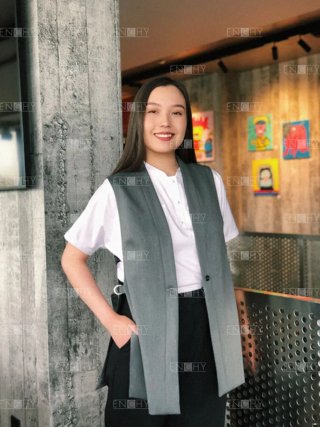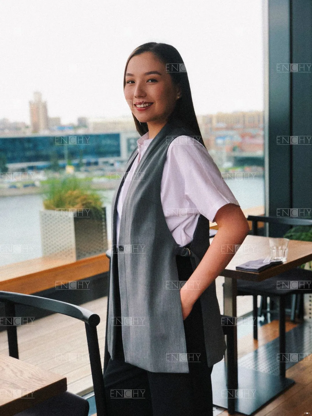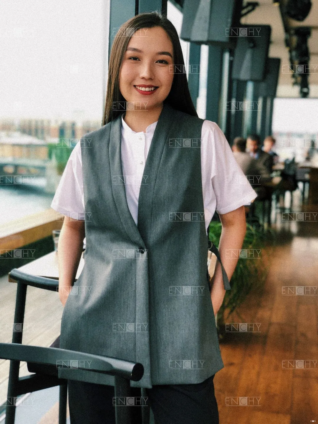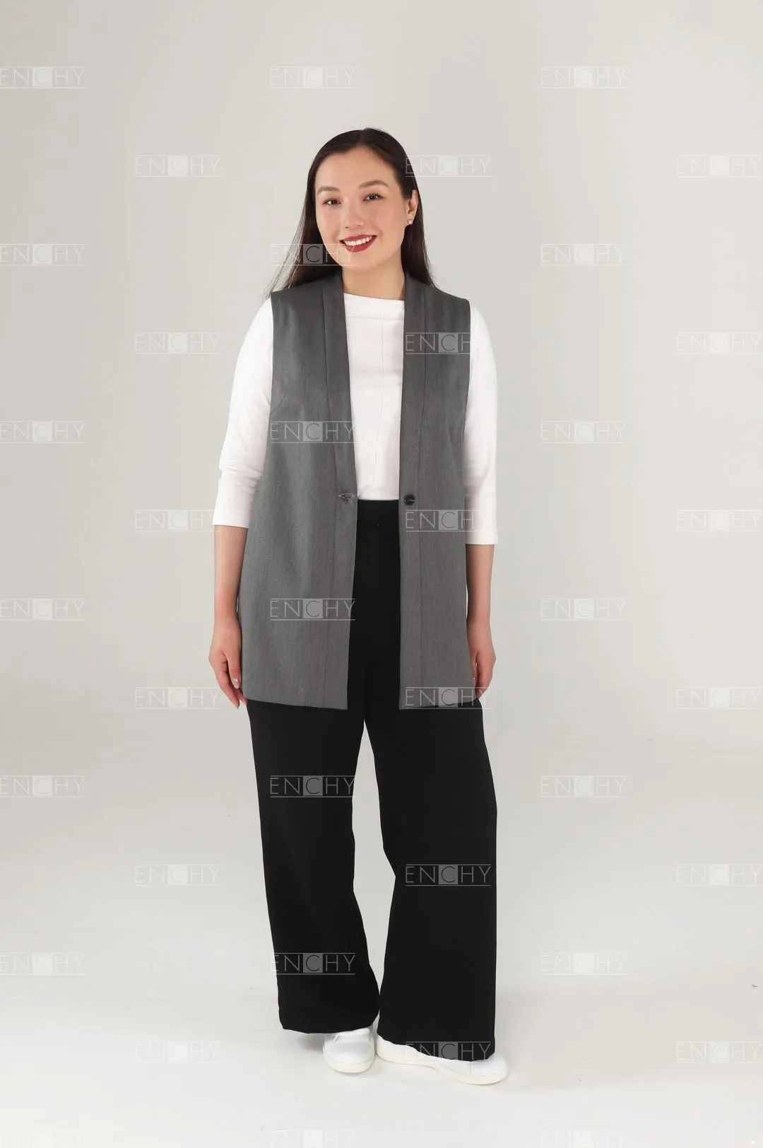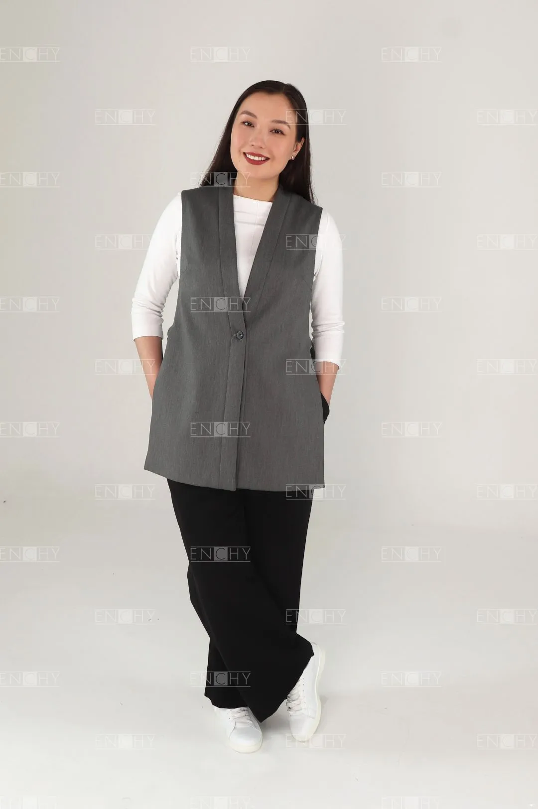Необычный стильный жилет прямого силуэта без боковых швов! Такой фасон станет универсальным решением для часто сменяемых коллективов благодаря тому, что он регулируется хлястиками на полукольцах в боковых швах. Перед с нагрудными вытачками, застежкой на 1 пуговицу, спинка с плечевыми вытачками.