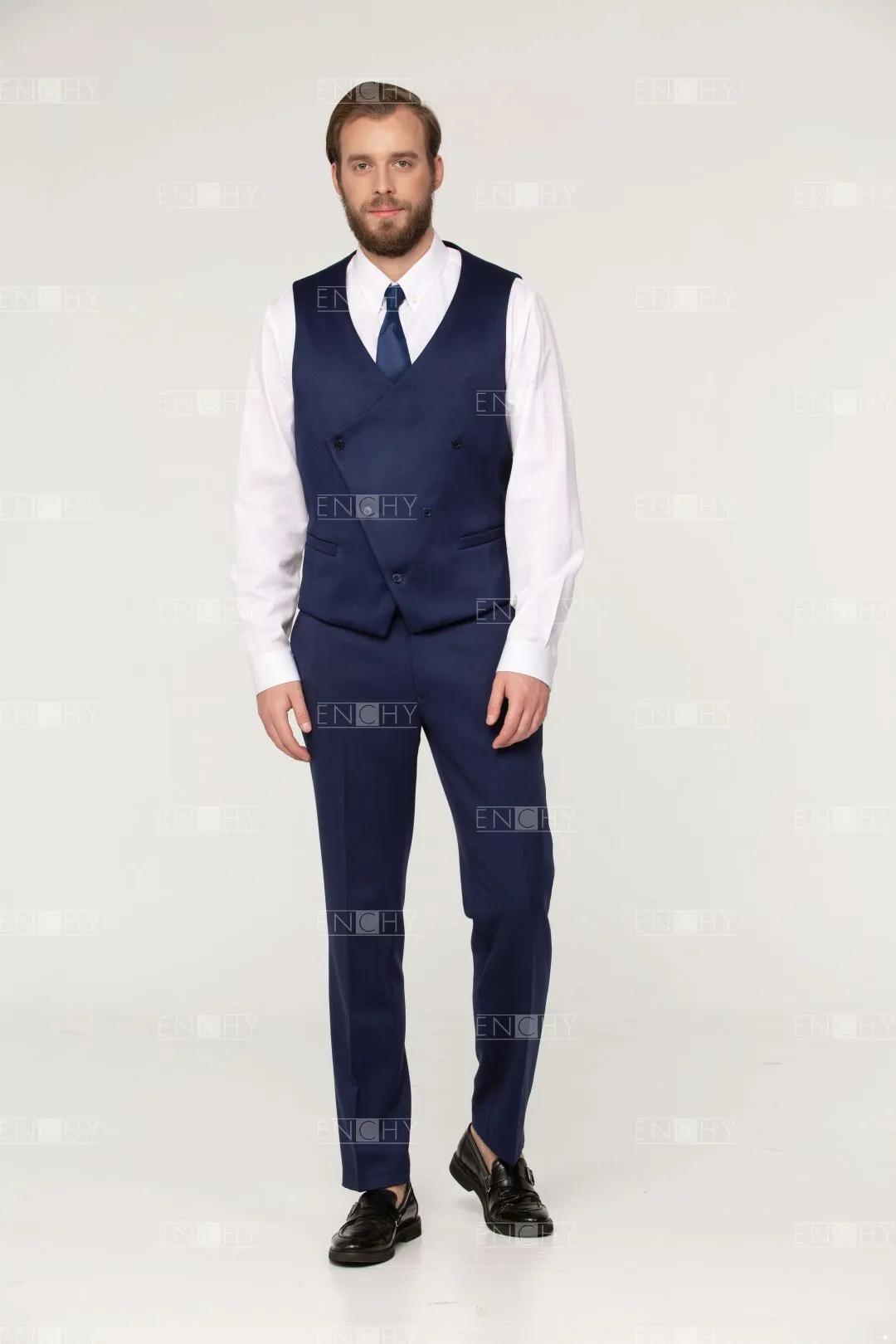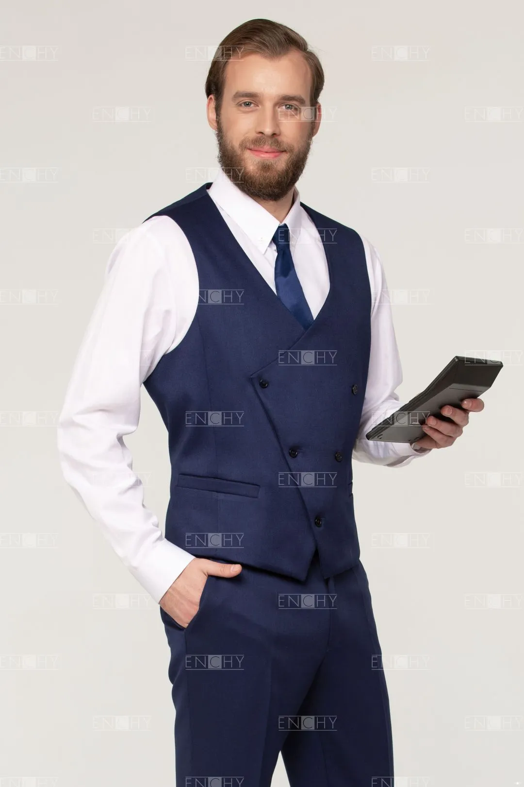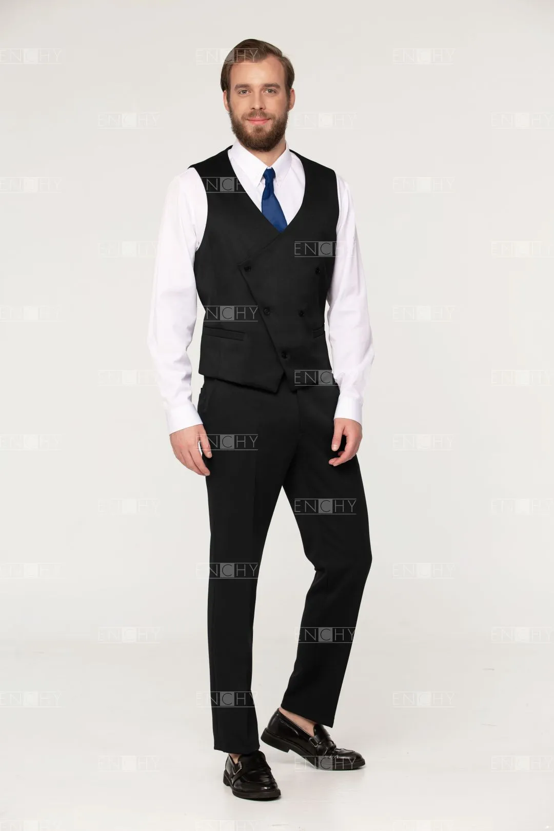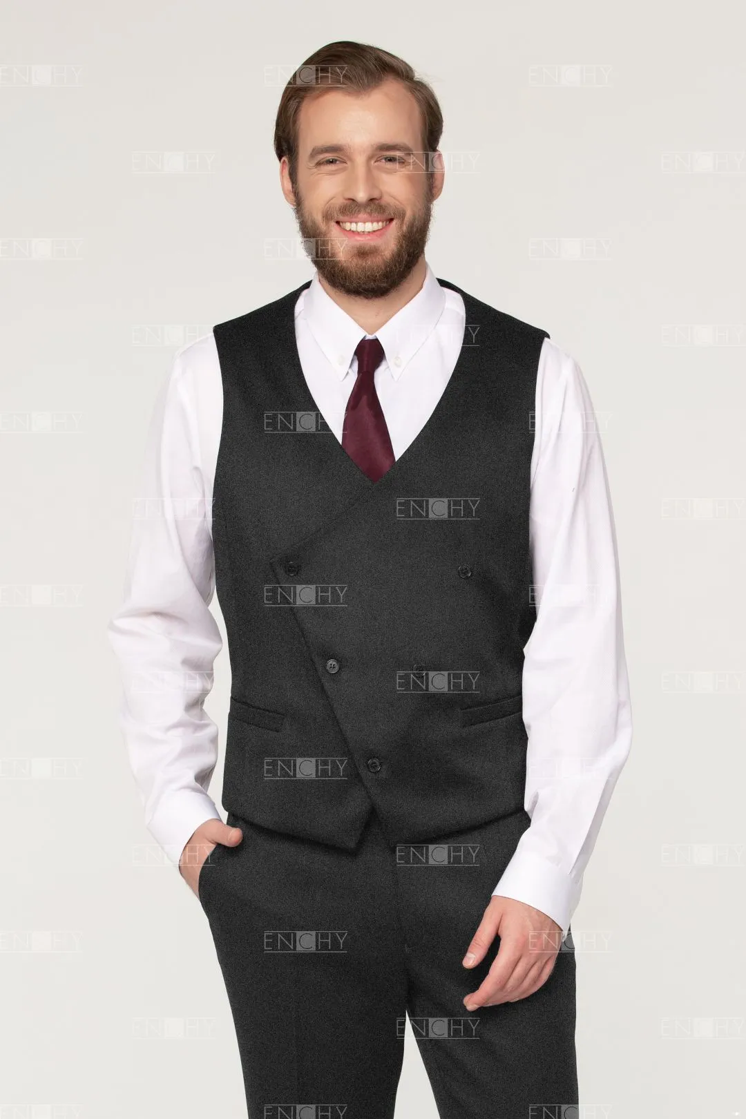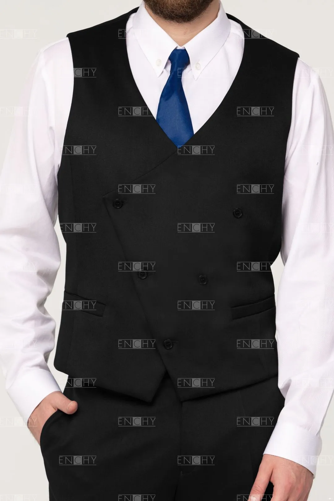 Стильный двубортный жилет с асимметричным бортом, усилить эффект можно кантом по краю борта. Жилет с V-образным вырезом, прорезными карманами с листочкой.