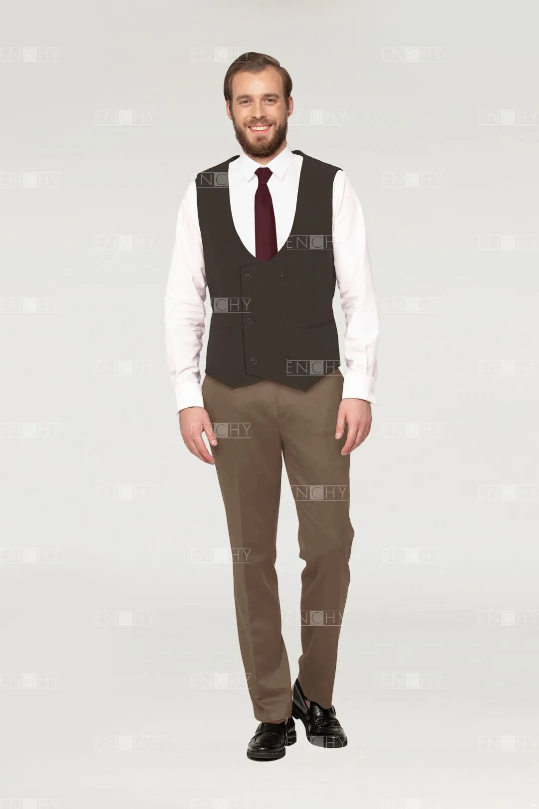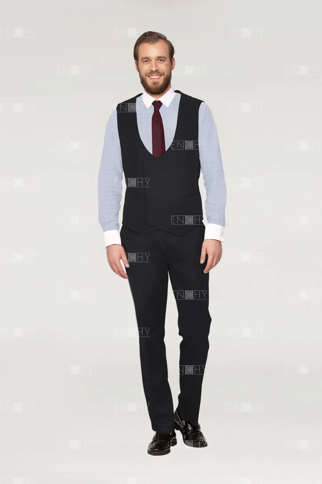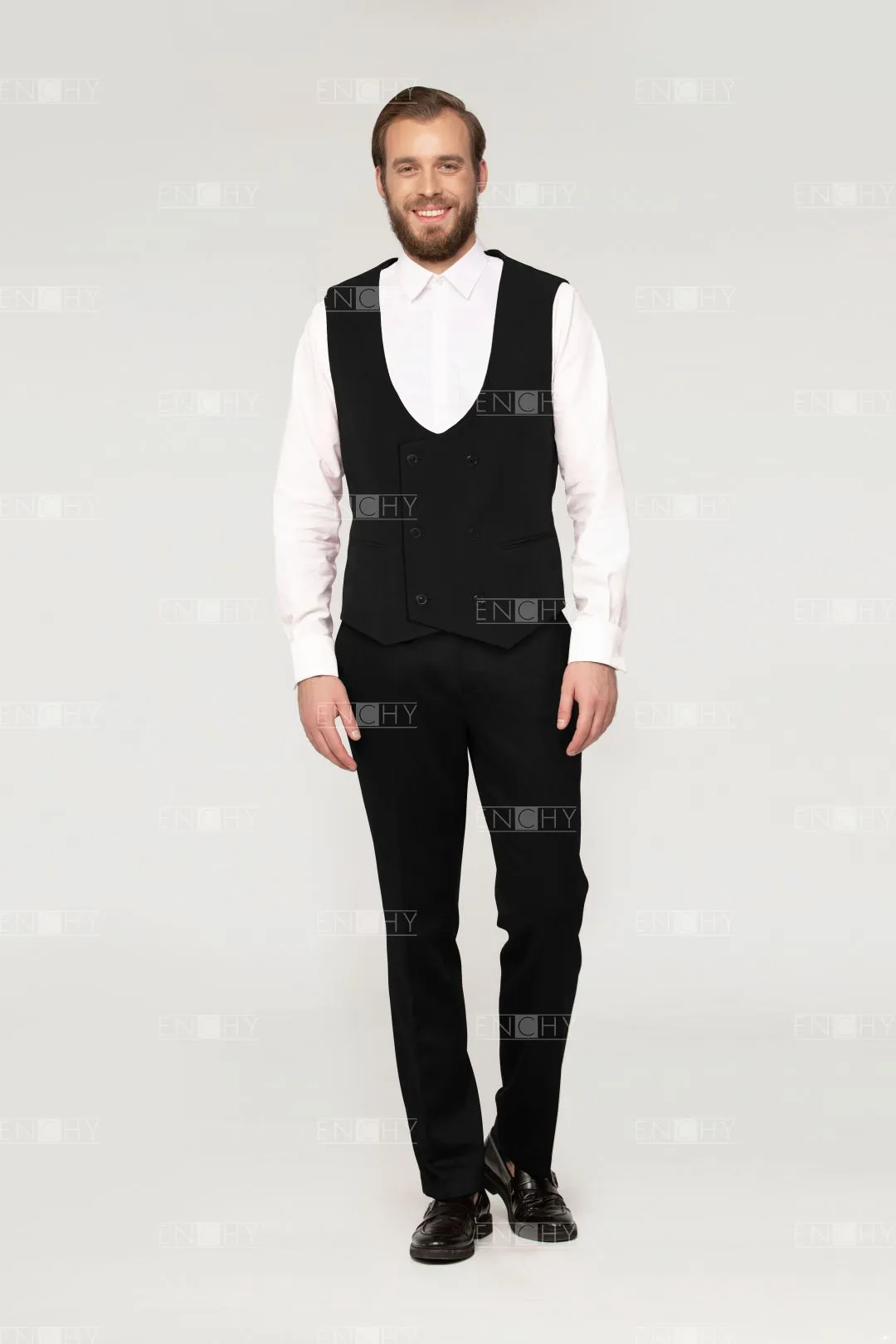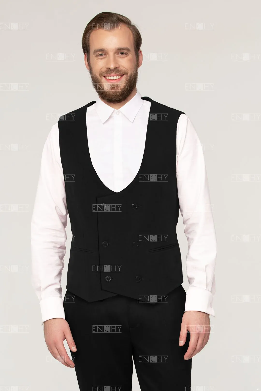 Классика жанра— двубортный жилет с глубоким округлым вырезом! На спинке имеется хлястик на полукольцах для регулировки посадки по фигуре. Эта модель будет отлично смотреть в составе костюма "тройки", как самостоятельная вещь в гардеробе официанта или бармена, также можно создать полноценный "смокинг" с пиджаком с атласными лацканами, сорочкой со складками и бабочкой!