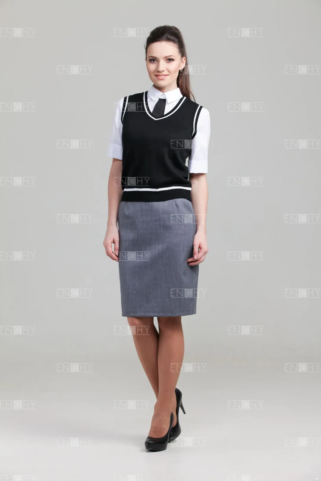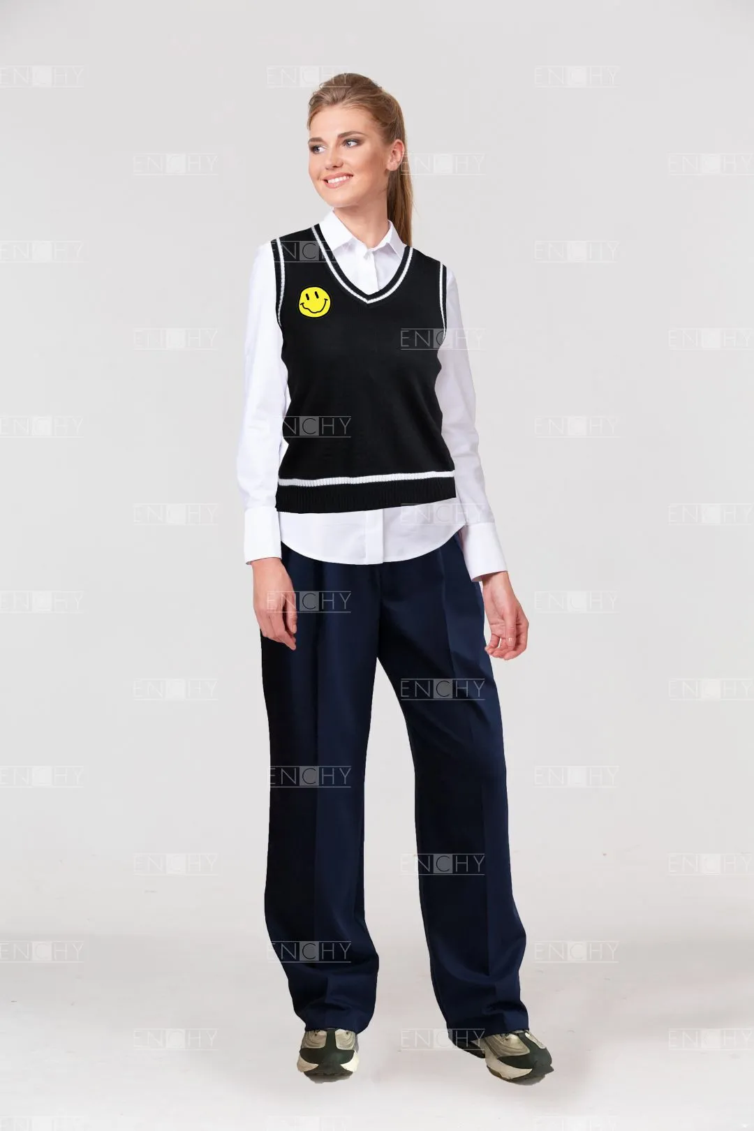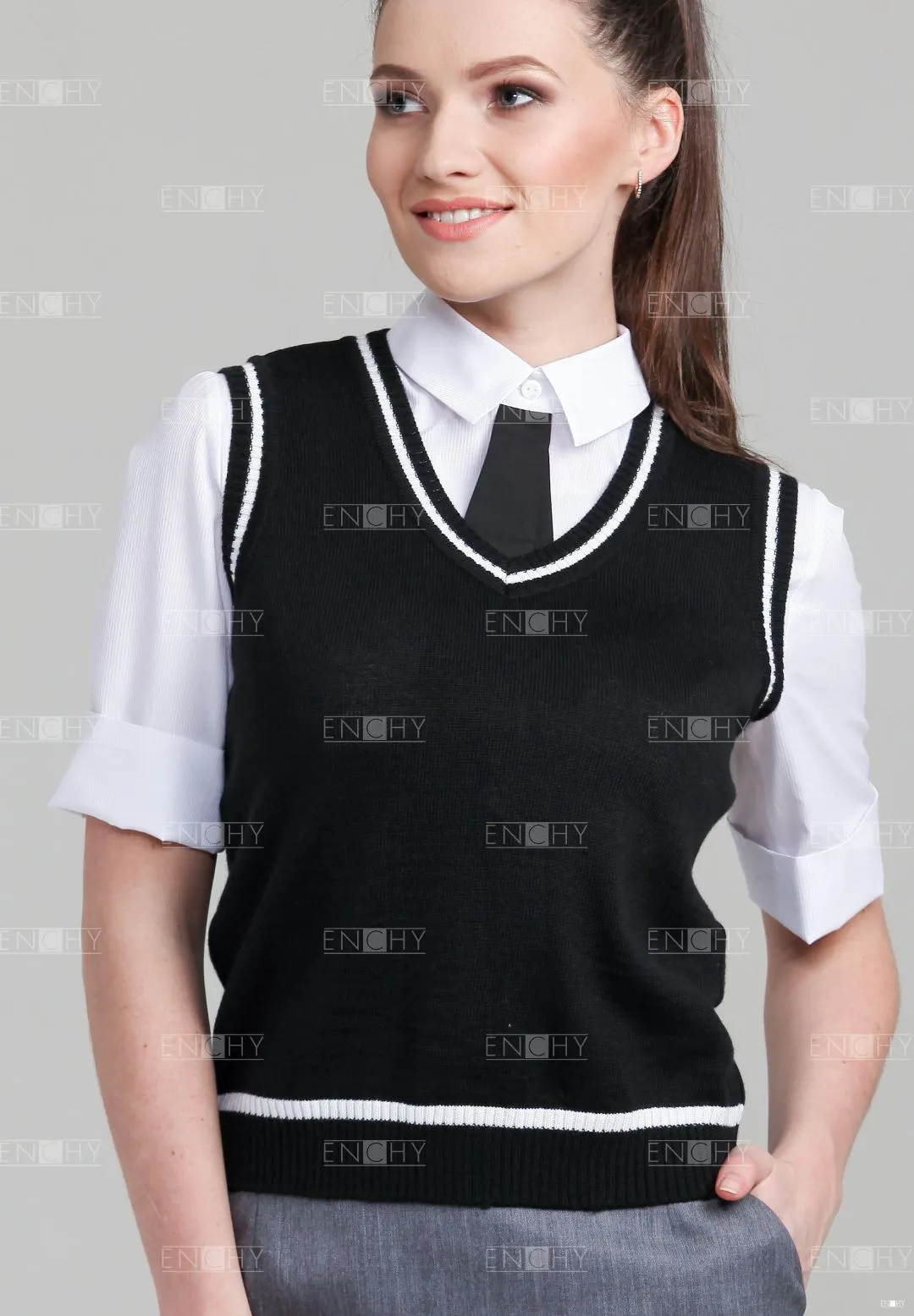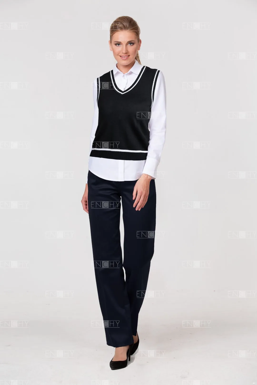 Жилет прямого силуэта с небольшим вырезом горловины стильно смотрится за счет контрастных полосок. Ничего лишнего, зато какой стиль! Яркий, модный, корпоративный - жилет, создающий правильное офисное настроение и свободу движения.