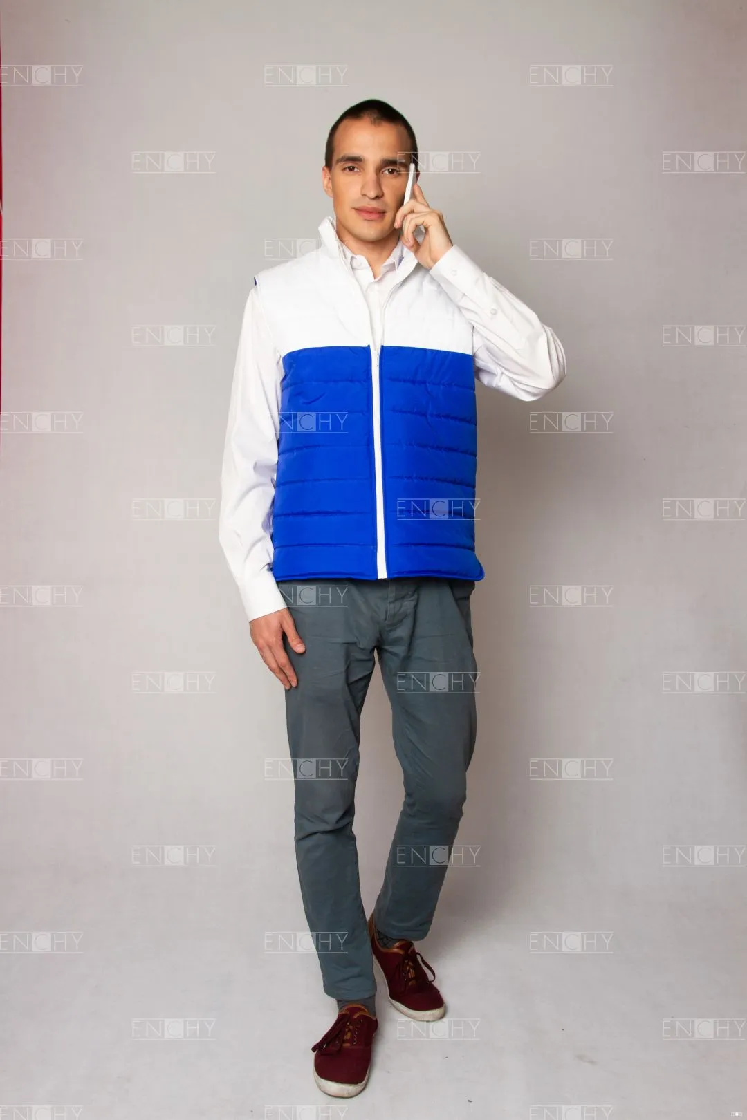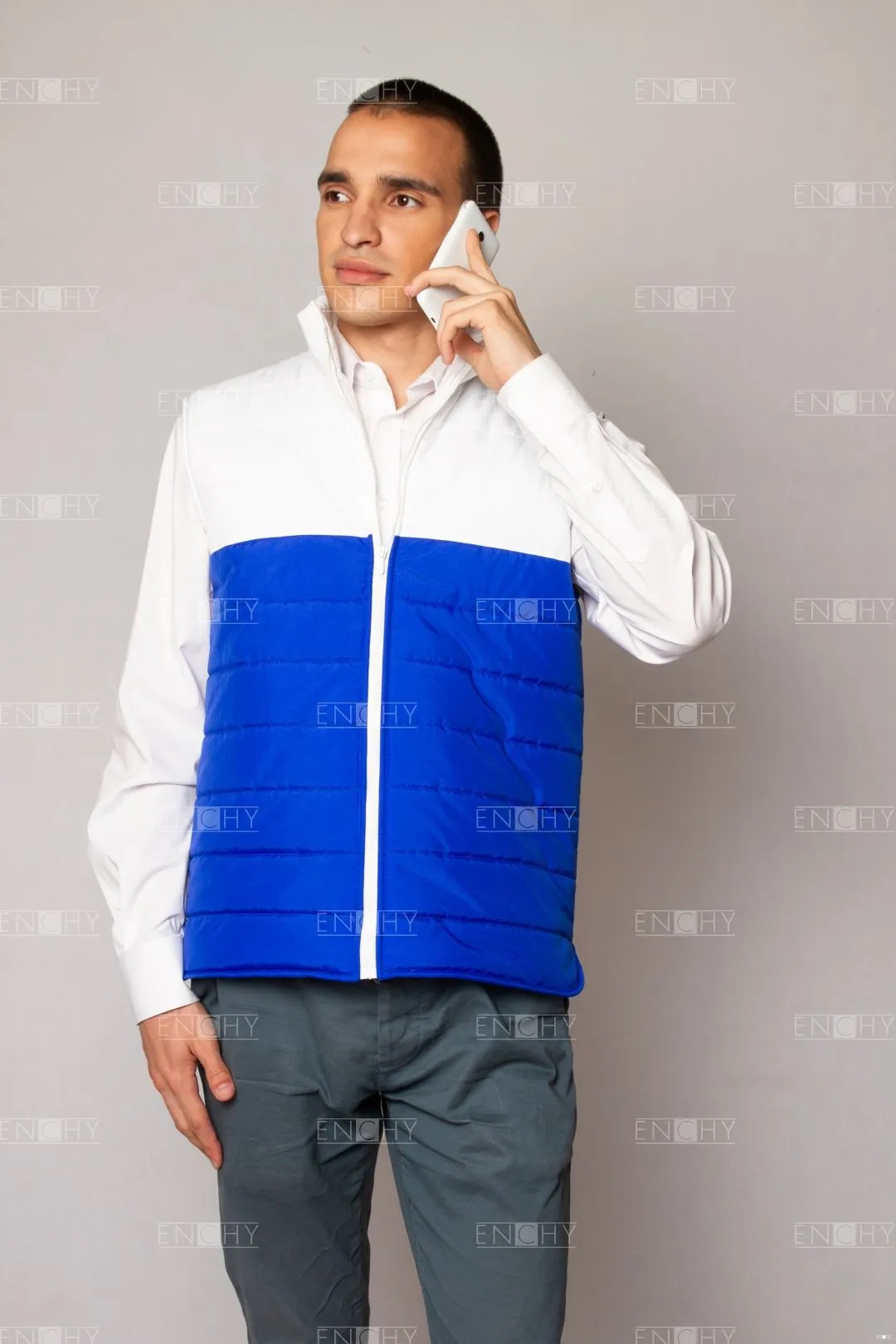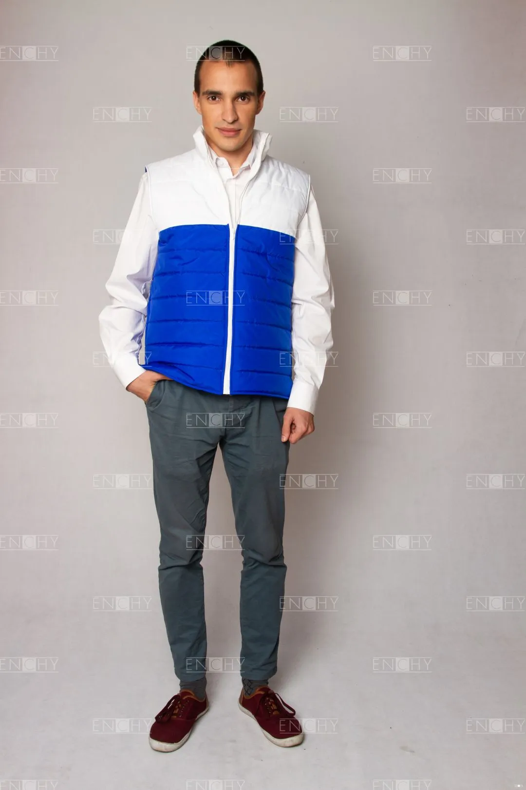 Тонкий модный жилет унисекс утеплен синтепоном. Прямой силуэт, удобная длина до бедер. Воротник-стойка. Застежка на молнию. Горизонтальная стежка. отрезная кокетка по переду и спинке дает возможность сочетать ваши фирменные цвета. Универсален как для мужчины так и для женщины.