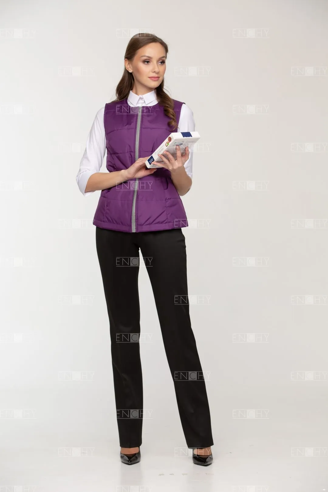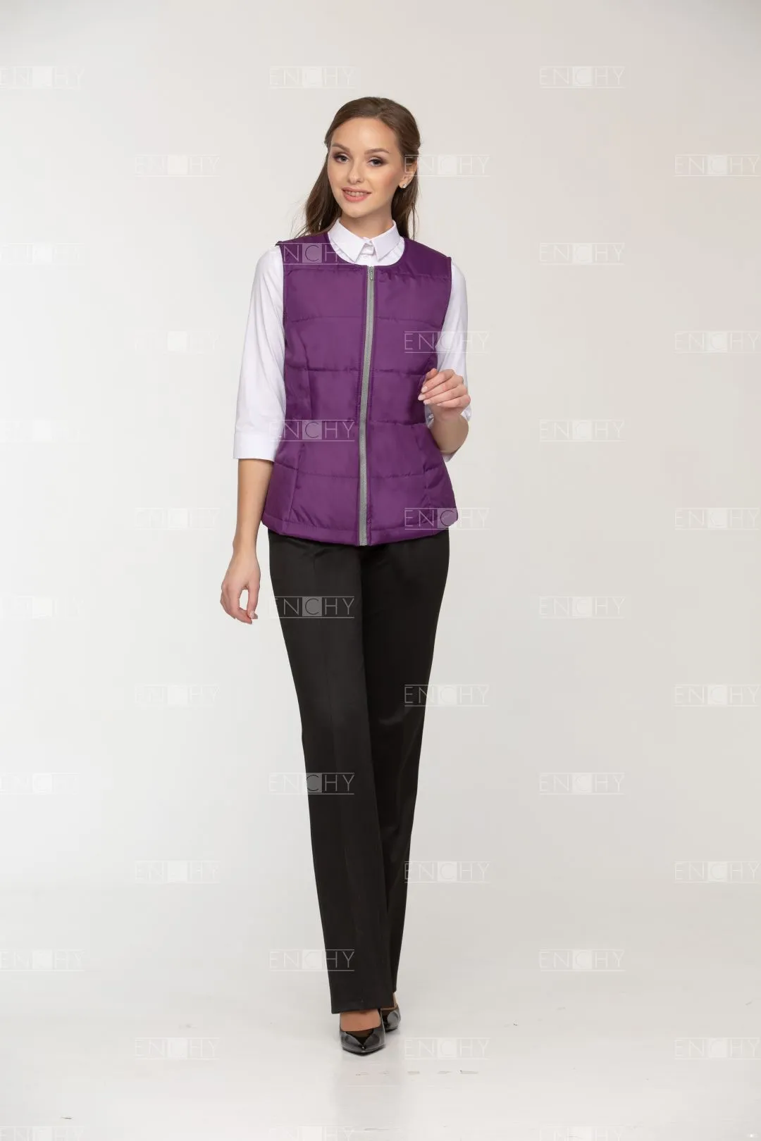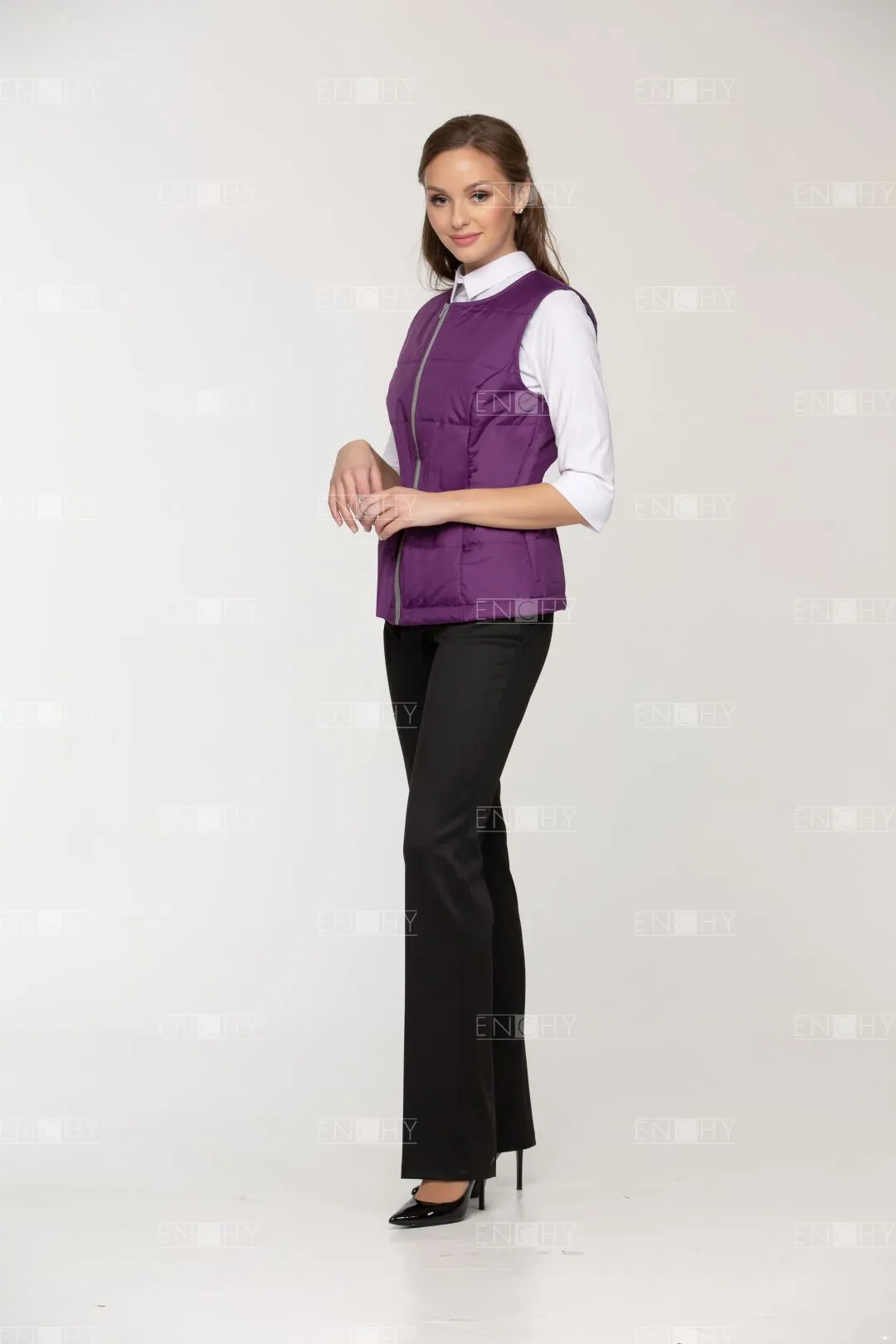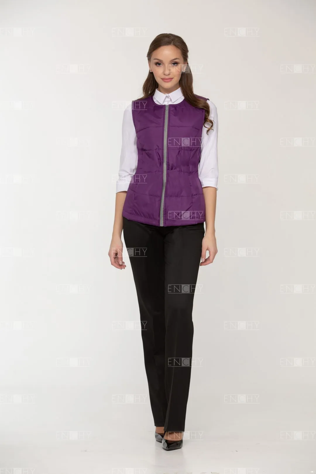 Жилет женский утепленный, на синтепоне. Приталенный силуэт, удобная длина чуть ниже бедер. Горловина круглая. Застежка на открытую молнию.