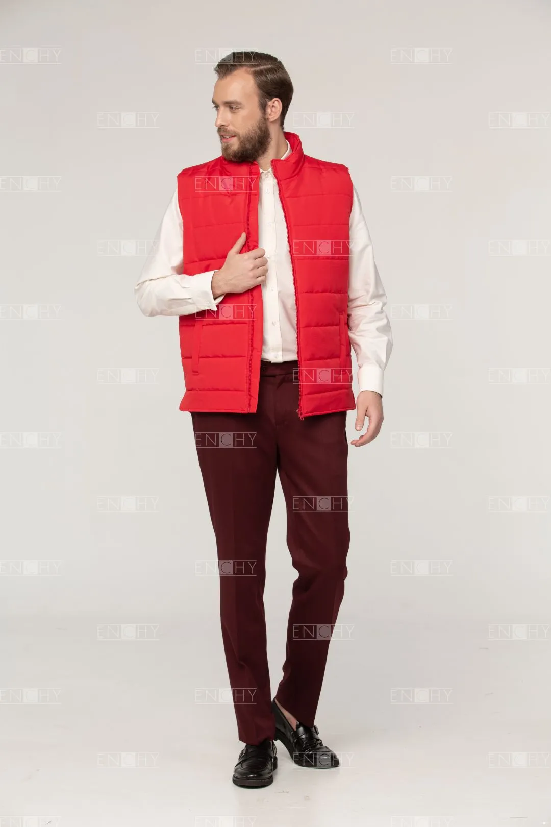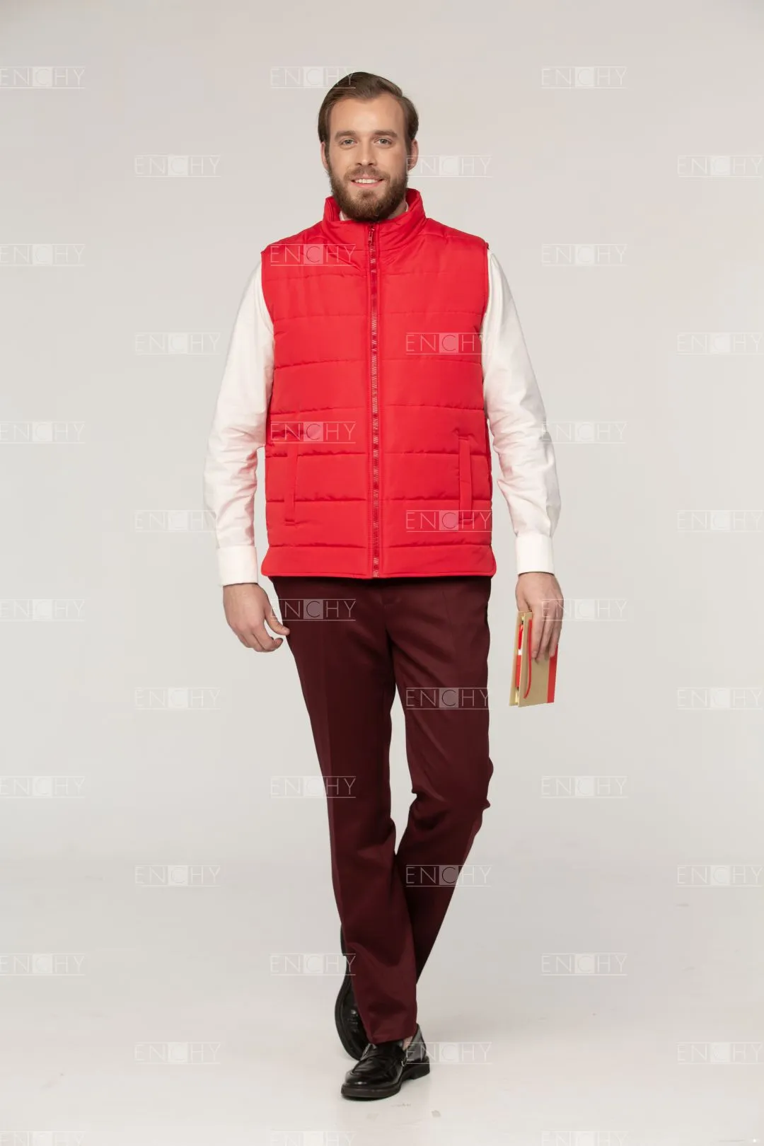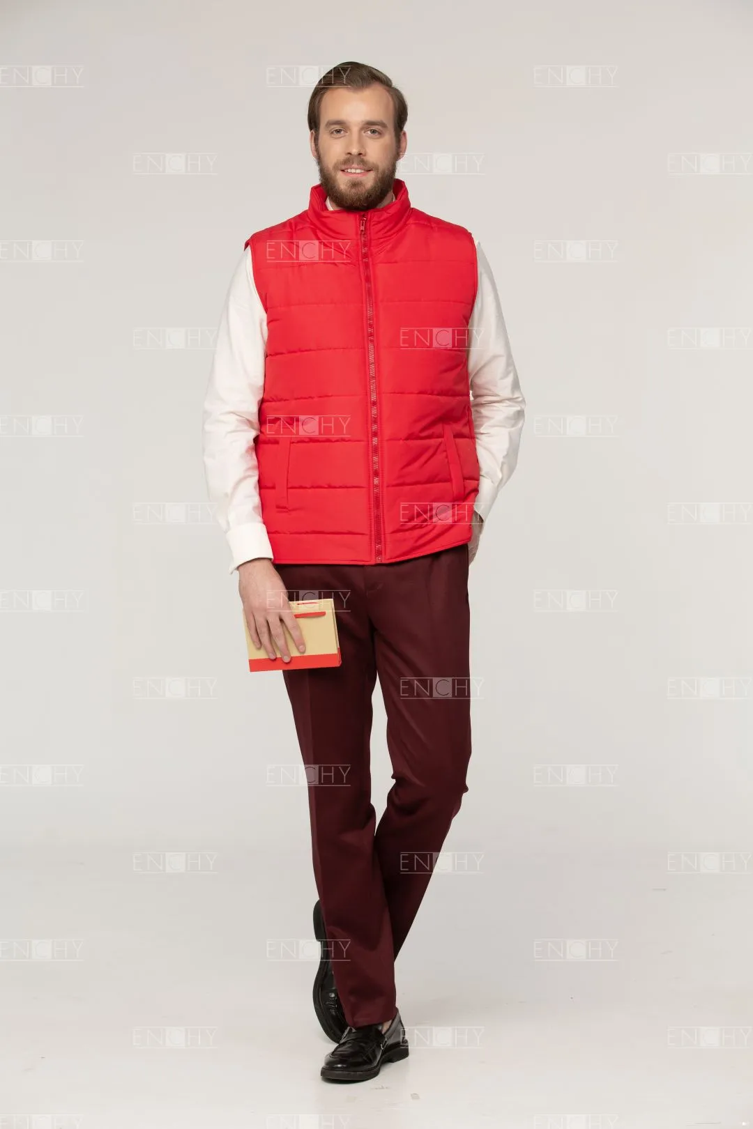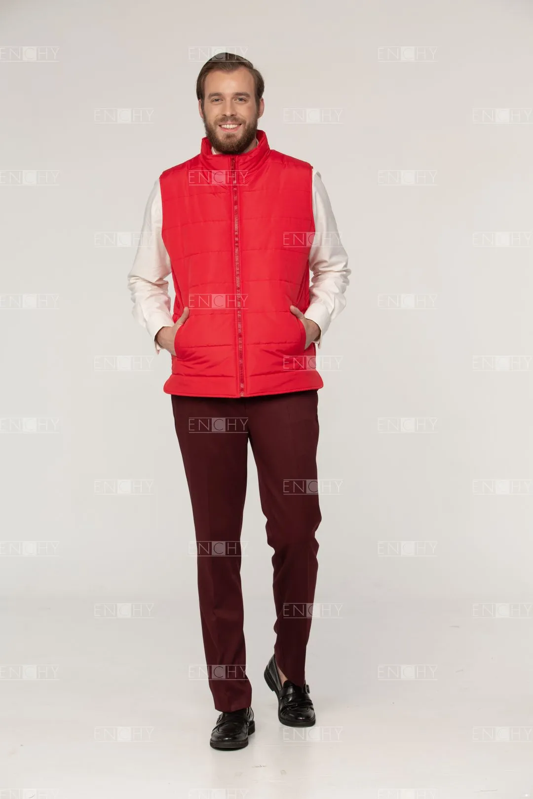 Жилет утепленный, на синтепоне. Прямой силуэт, удобная длина до бедер. Спереди небольшие прорезные карманы с листочкой. Вороткий стойка. Застежка на молнию до конца. Сзади жилет слегка удлинен.